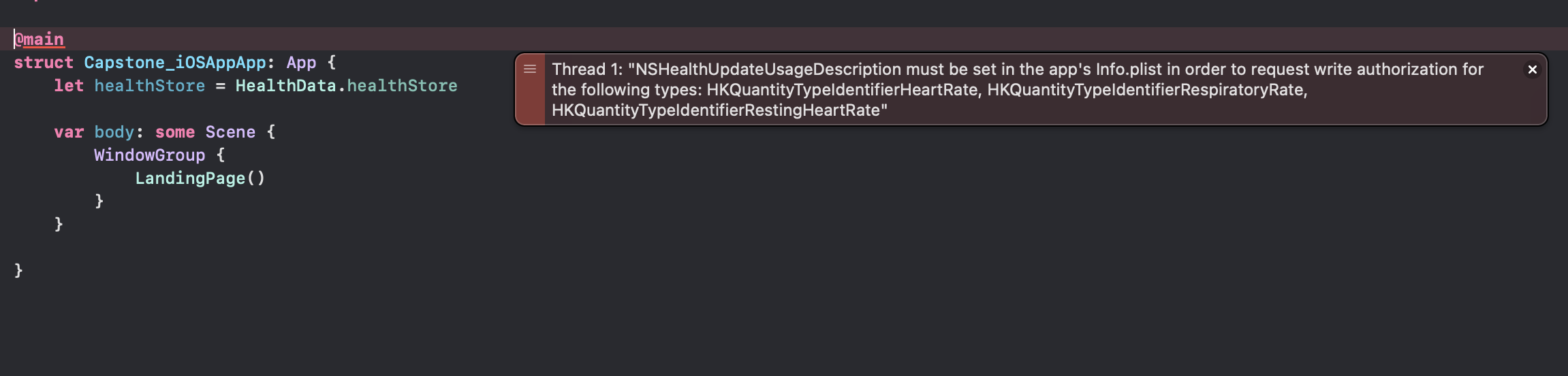 I'm trying to request access to read/write from HealthKit but am un able to figure out how to solve this error. When I attempt to put in "NSHealthUpdateUsageDescription" to my Info.plist file I get the Privacy - "Update Usage Description" equivalent, but still get this error.