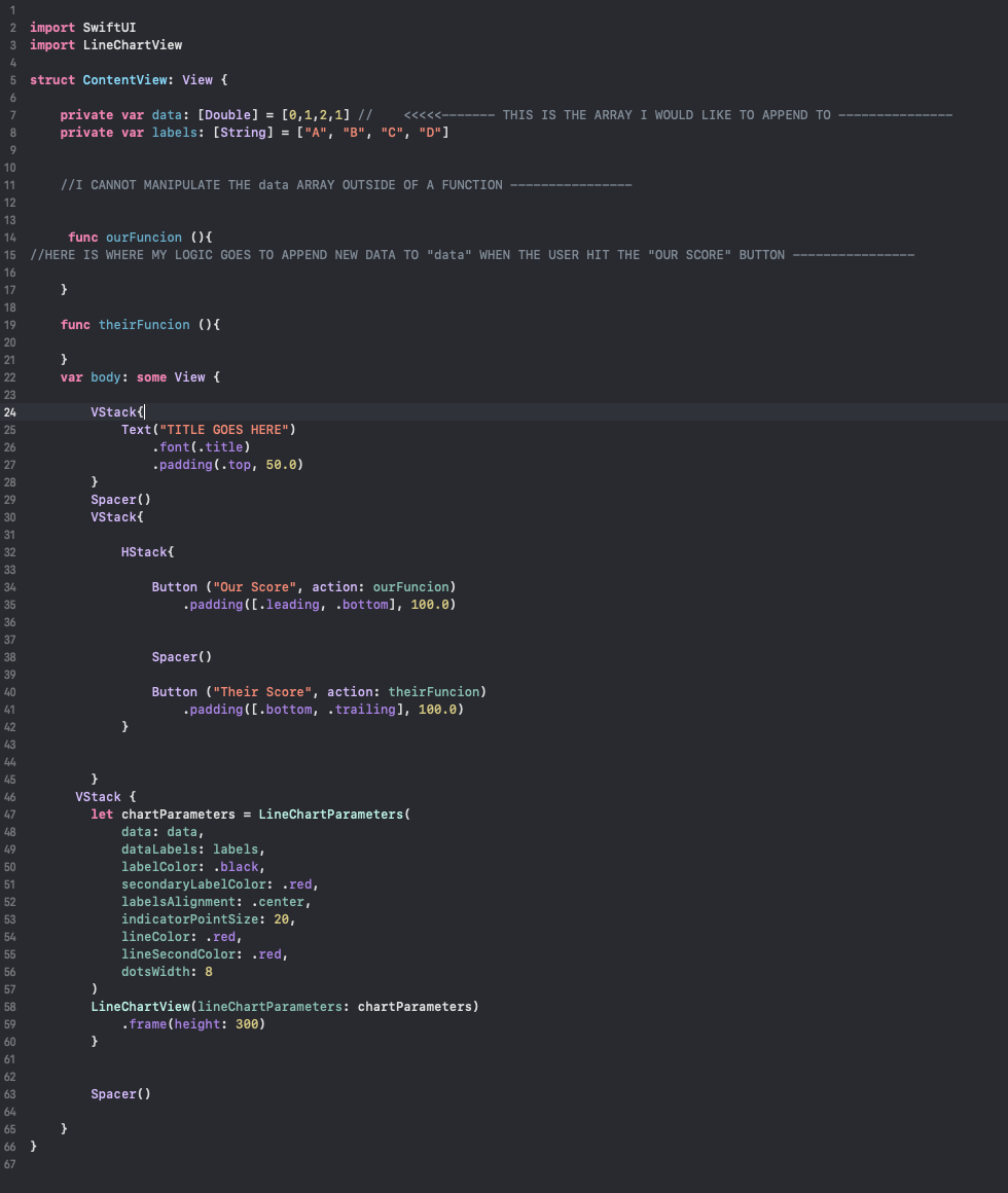 I have included a LineChartView package in my project, and it works fine out of the package. https://github.com/Jonathan-Gander/LineChartView. However, I have only found that I can only add/change the data in the initializer of the array.