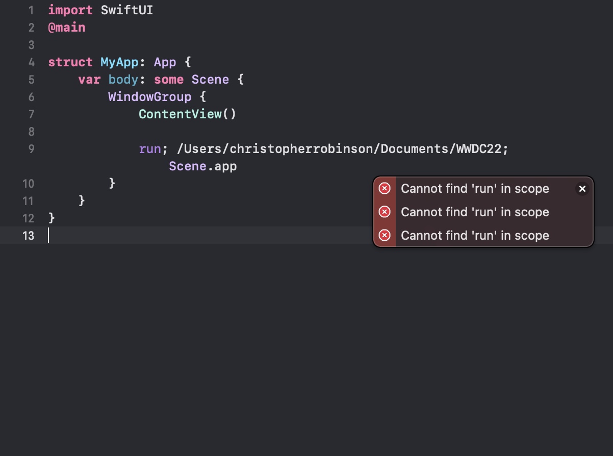 run; /Users/christopherrobinson/Documents/WWDC22; Scene.app