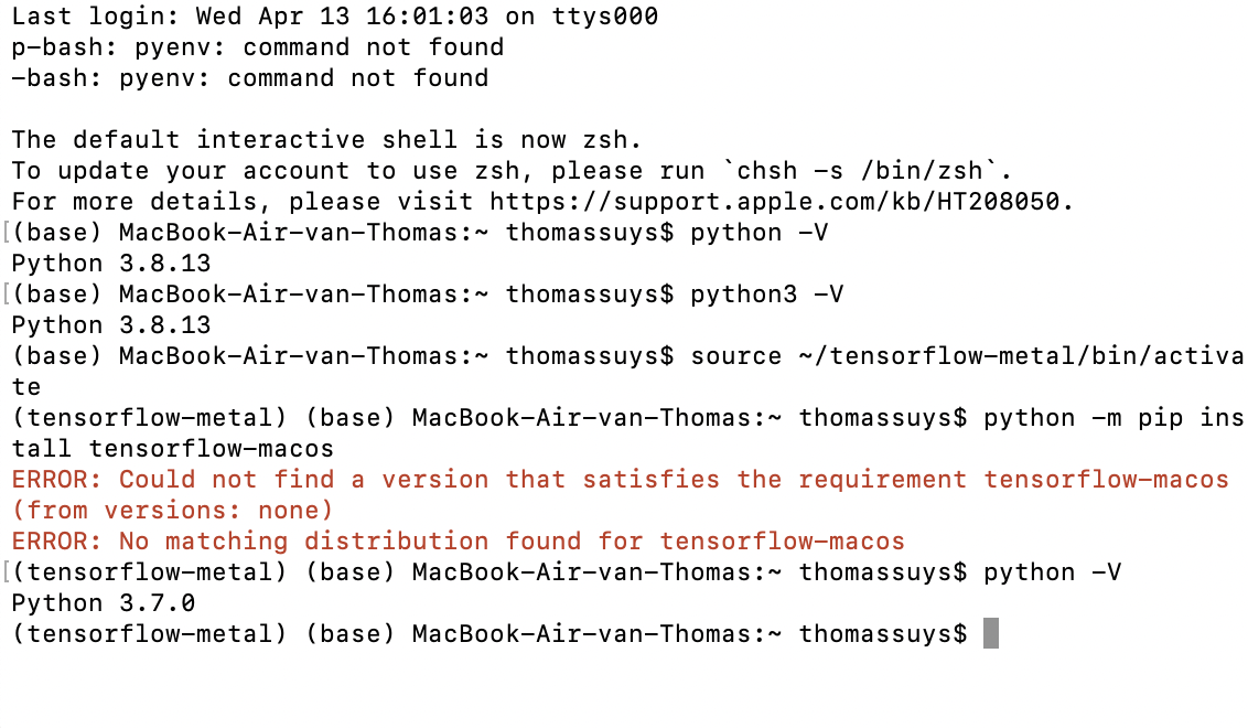 I recently got my new Macbook with Apple M1 chip. I'm trying to install Tensorflow according to the guide found at this URL: https://developer.apple.com/metal/tensorflow-plugin/. However, after installing everything I get the following error: