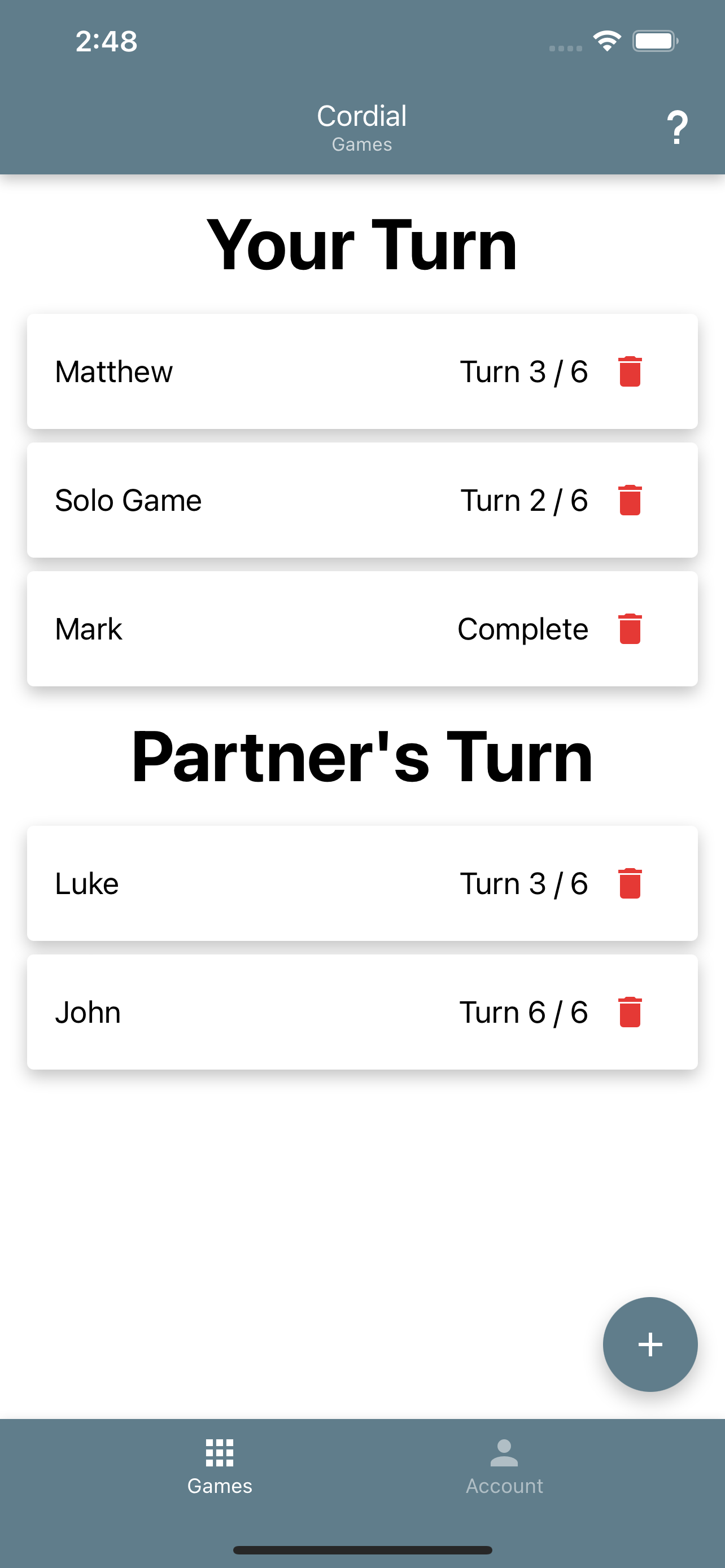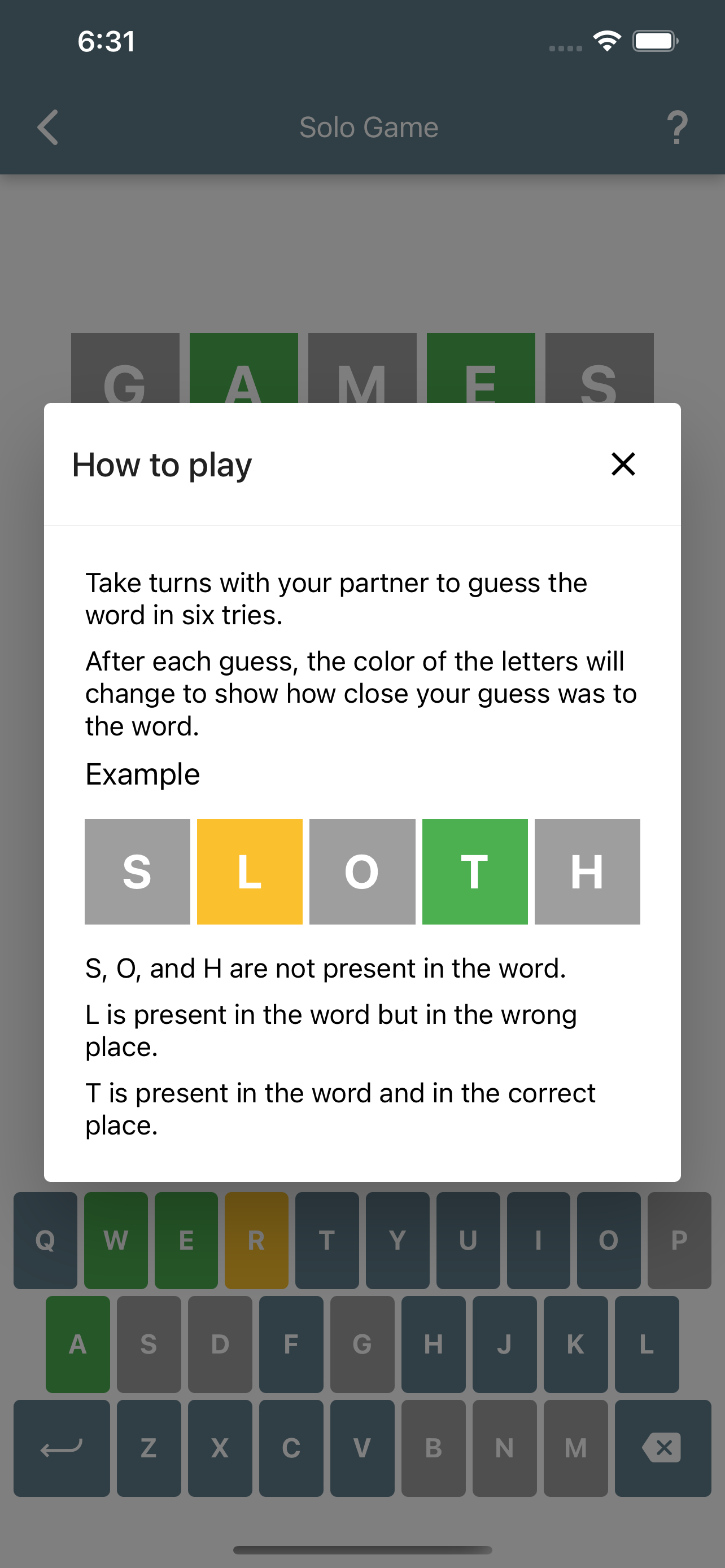 Description: Cordial is a cooperative word puzzle game designed to be played with friends! Take turns with your partner trying to guess the hidden word. Each guess provides clues as to what the hidden word is by indicating which letters are in the word if they're in the correct spot.