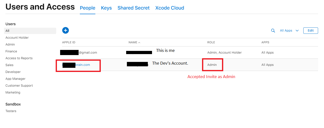 It's weird because I added them as Admins in my Apple Developer/App Store Connect account