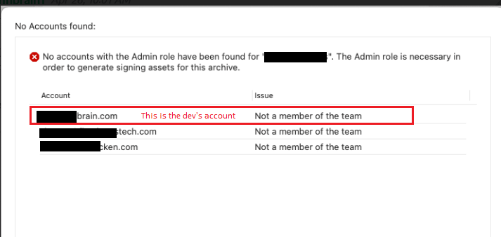 I've hired developers overseas to create my app, I'm trying to test the demo version of it using app store connect but they're having trouble with permissions. They've sent me two pictures from the Xcode IDE saying they aren't a member of the team which isn't true:
