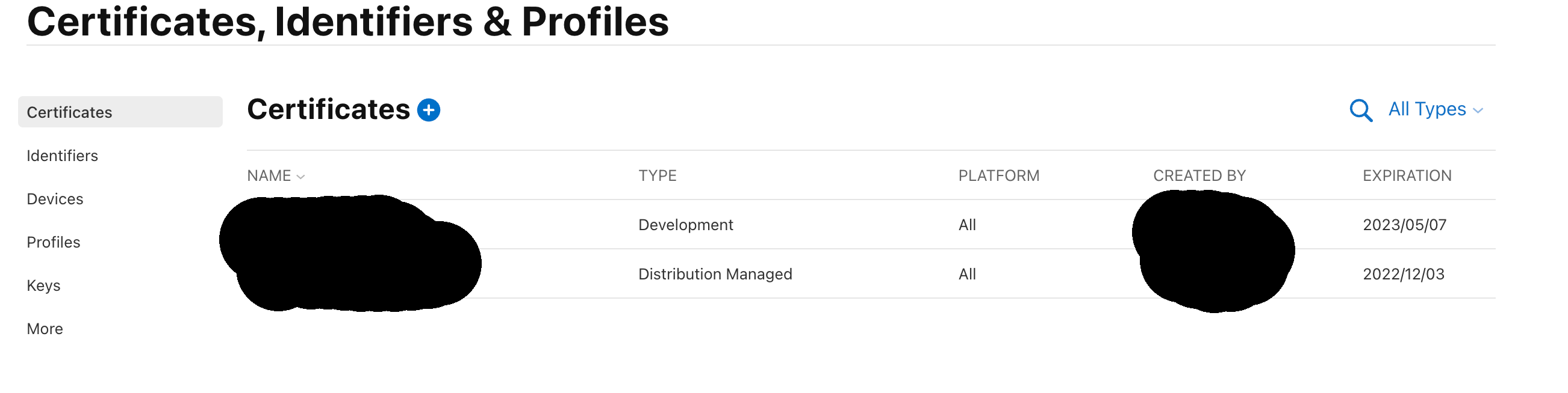 I have two certificates in my Apple Developer Portal as follows: