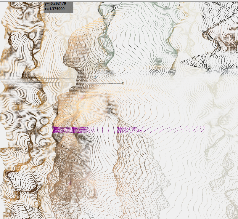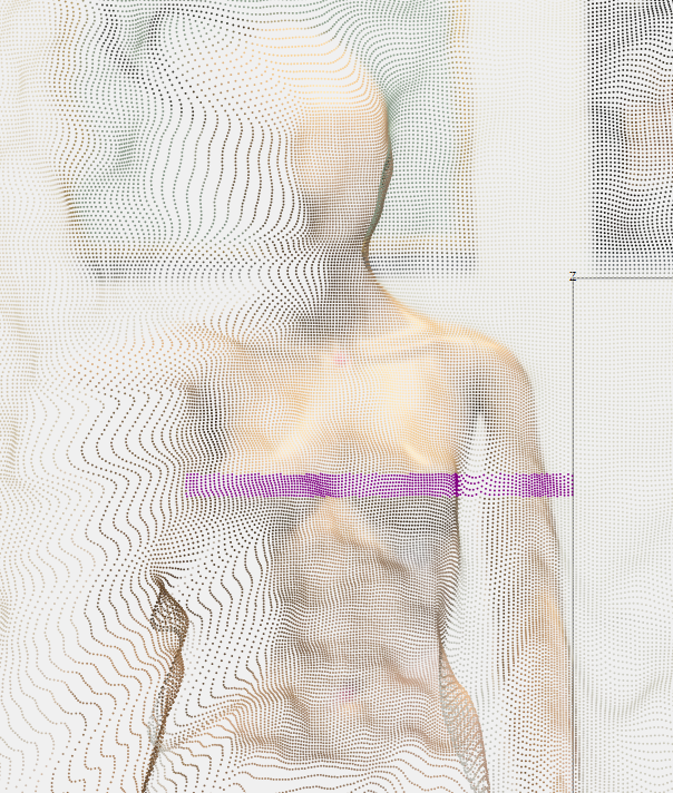 The same code on an iPhone 13 produces depth maps that result in point cloud further below (Figure 2 -- straight on view, angled view, and side view). There is no longer any clear distinction between objects and the background becasue the depth data appears to be "smoothed" between the mannequin and the background -- i.e., there are seven or eight points between the subject and background that are not realistic and make it impossible to do any meaningful processing such as segmenting the scene.