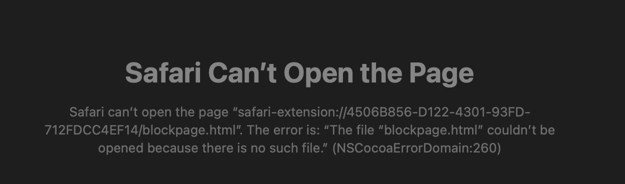 It seems path component of "blockpage" is missing. The right path should be "safari-extension://4506B856-D122-4301-93FD-712FDCC4EF14/blockpage/blockpage.html"