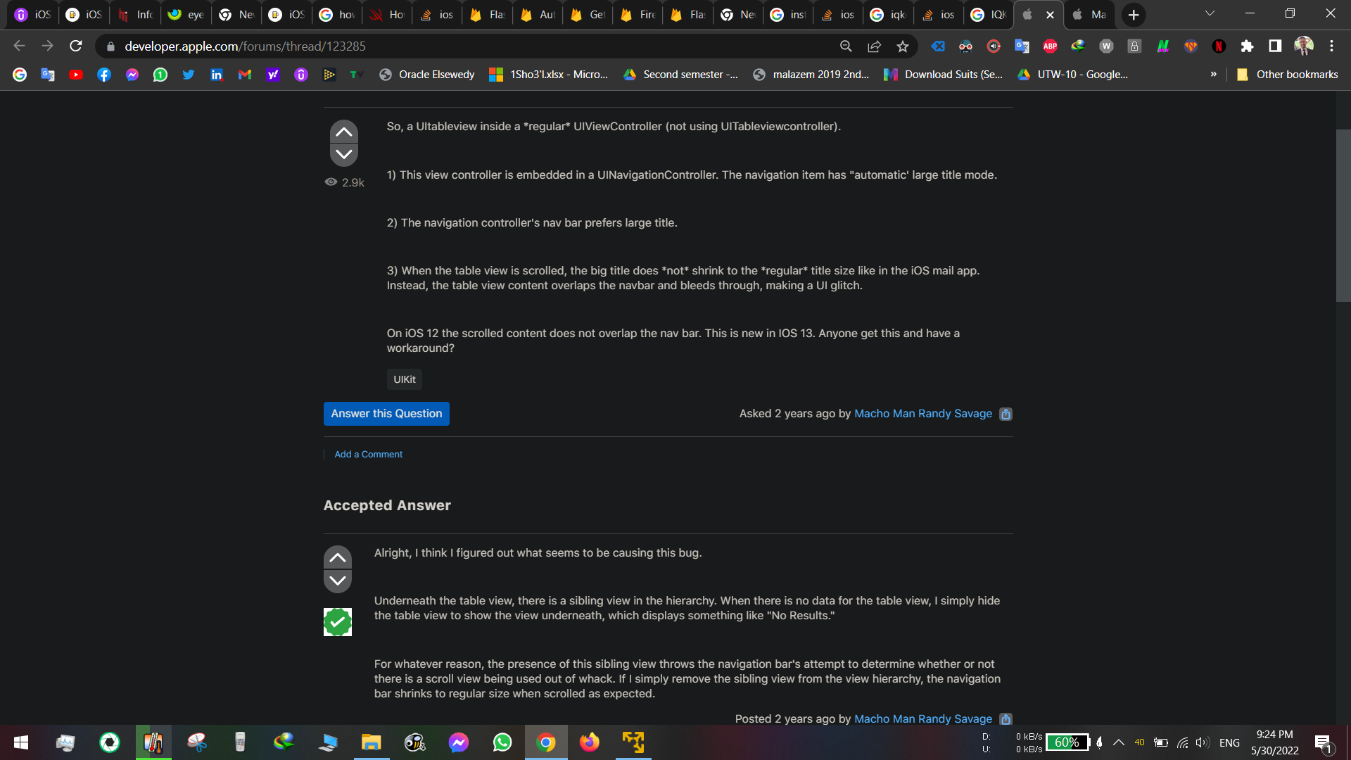 Hello im new at ios, faced a problem and it has been 3 hours and not yet solved I saw that post and answer from 2 years ago (first image) , and my problem seems similar to it but i dont have large titles enabled. so what happens with me is: in image 2: thats without showing keyboard an without scrolling (notice the top(nav bar) and button are yellow colored cause the background color of the whole view is yellow) in image 3 when keyboard showed up, pushing things upward, now the color of the top (nav bar) is gray AS THE TABLE VIEW, but thats not the issue, the issue is that the cells cover the top nav bar !! in image 4, if i drag my mouse up (scroll down), notice the top nav bar color is now purple (cause the bar tint color of the nav bar is set to purple)