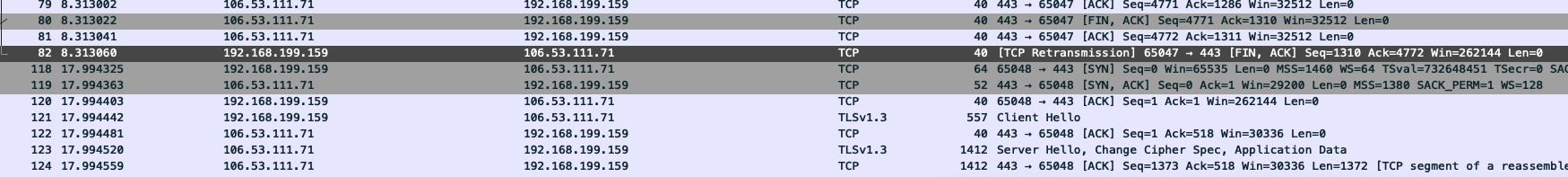 Certificate related packages are as follows: 123 17.994520 106.53.111.71 192.168.199.159 TLSv1.3 1412 Server Hello, Change Cipher Spec, Application Data 124 17.994559 106.53.111.71 192.168.199.159 TCP 1412 443 → 65048 [ACK] Seq=1373 Ack=518 Win=30336 Len=1372 [TCP segment of a reassembled PDU]