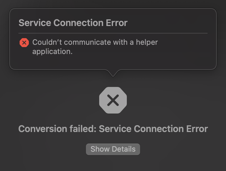I get the message: "Service Connection Error. Couldn't communicate with a helper application. Conversion Failed."