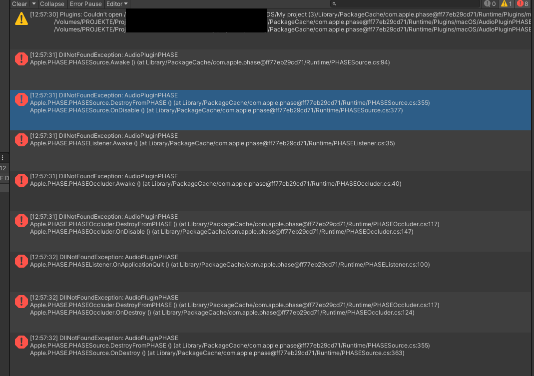 With Unity 2020.3.33f1 installing first Core, then PHASE with the Demo-file, on run i get these console output.