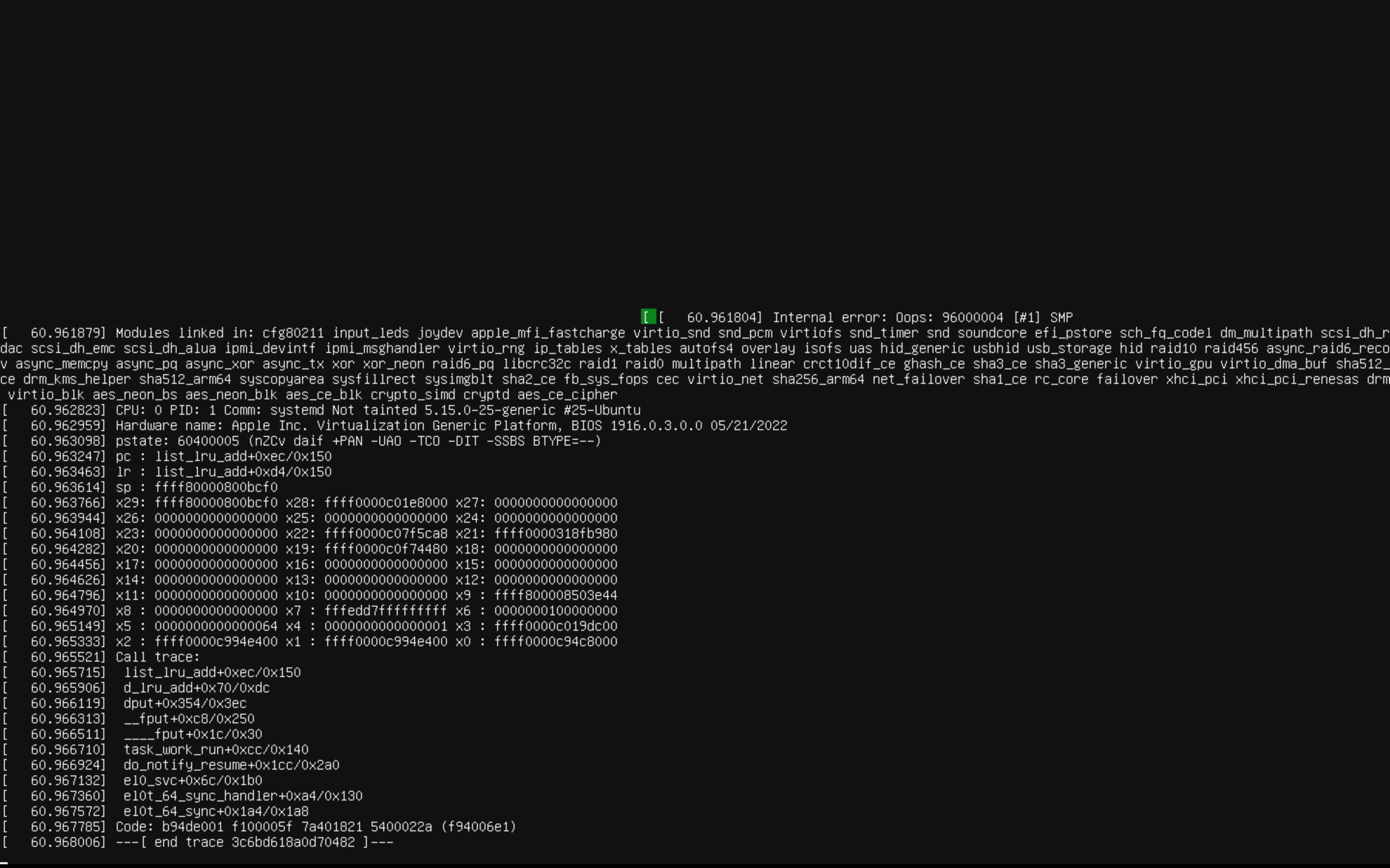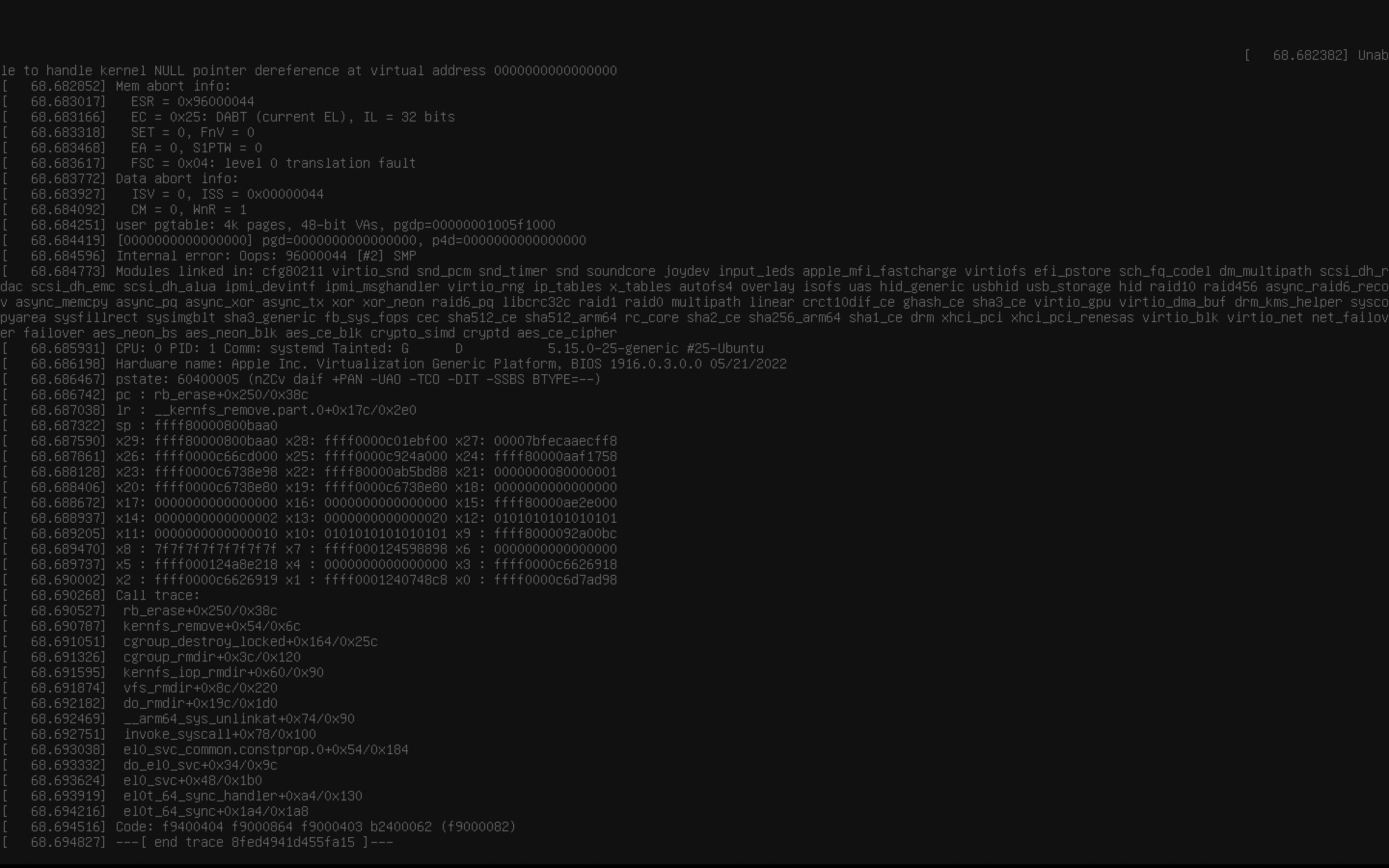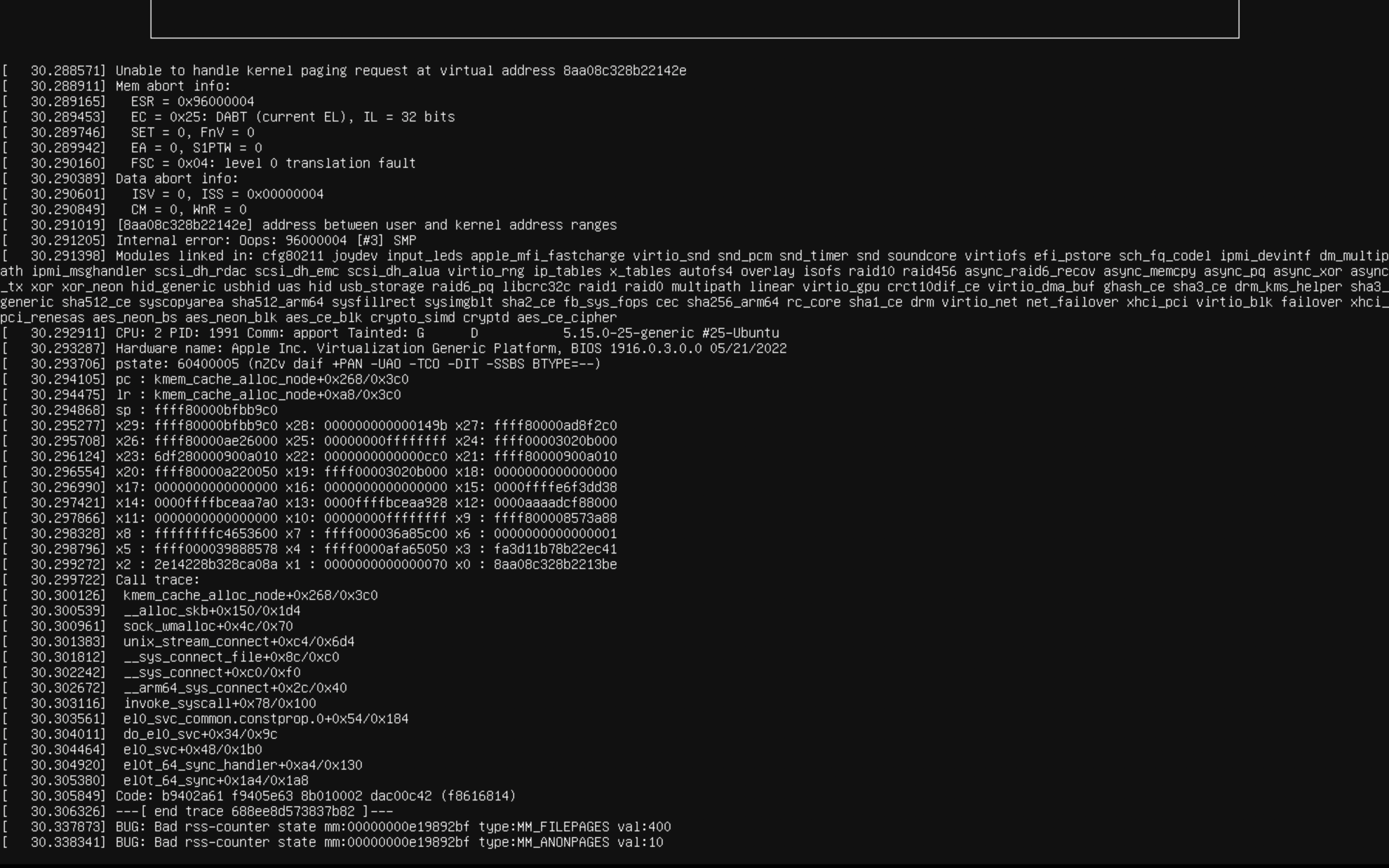 [ 559.692638] Modules linked in: joydev hid_generic usbhid hid apple_mfi_fastcharge binfmt_misc aes_ce_blk crypto_simd cryptd aes_ce_cipher ghash_ce gf128mul libaes nls_ascii sha3_ce nls_cp437 sha3_generic sha512_ce vfat fat sha512_arm64 virtio_gpu sha2_ce virtio_dma_buf drm_kms_helper virtio_console virtio_balloon sha256_arm64 evdev sha1_ce efi_pstore virtiofs drm fuse configfs efivarfs virtio_rng rng_core ip_tables x_tables autofs4 ext4 crc16 mbcache jbd2 crc32c_generic virtio_net net_failover failover virtio_blk xhci_pci xhci_hcd usbcore usb_common crct10dif_ce crct10dif_common virtio_pci virtio_ring virtio