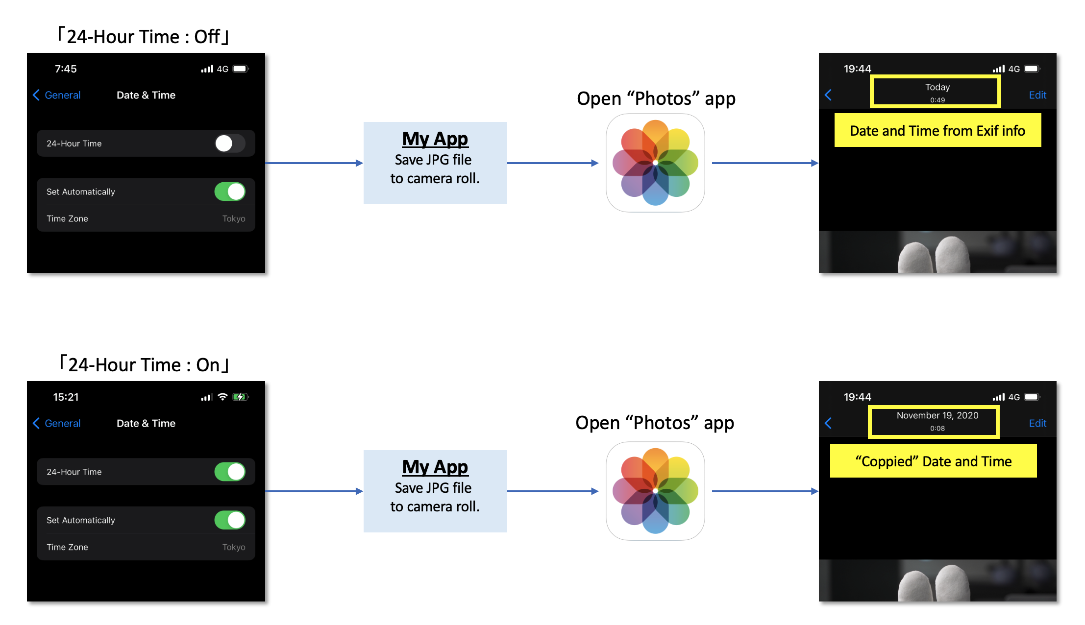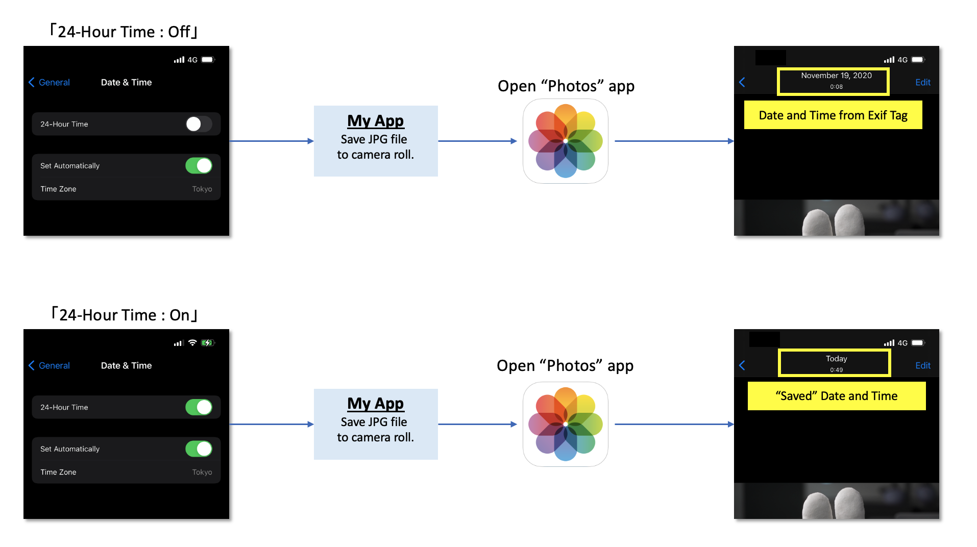 There is a difference in the date and time displayed in the "Photos" app depending on whether the 24-hour display setting in iOS is set to On or Off when saving.