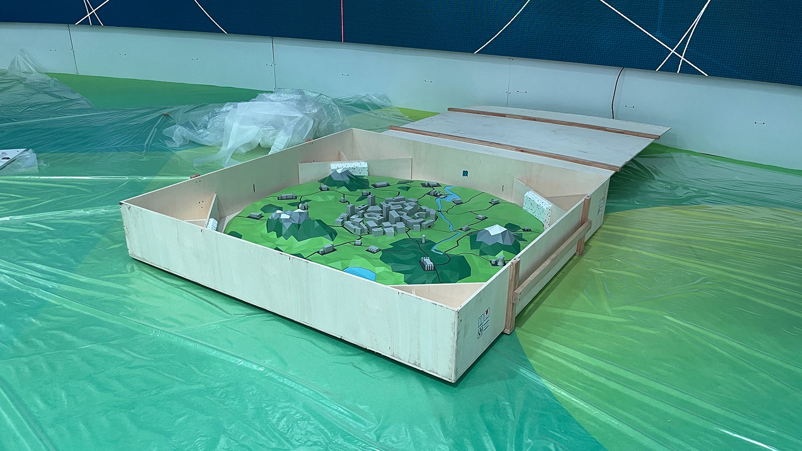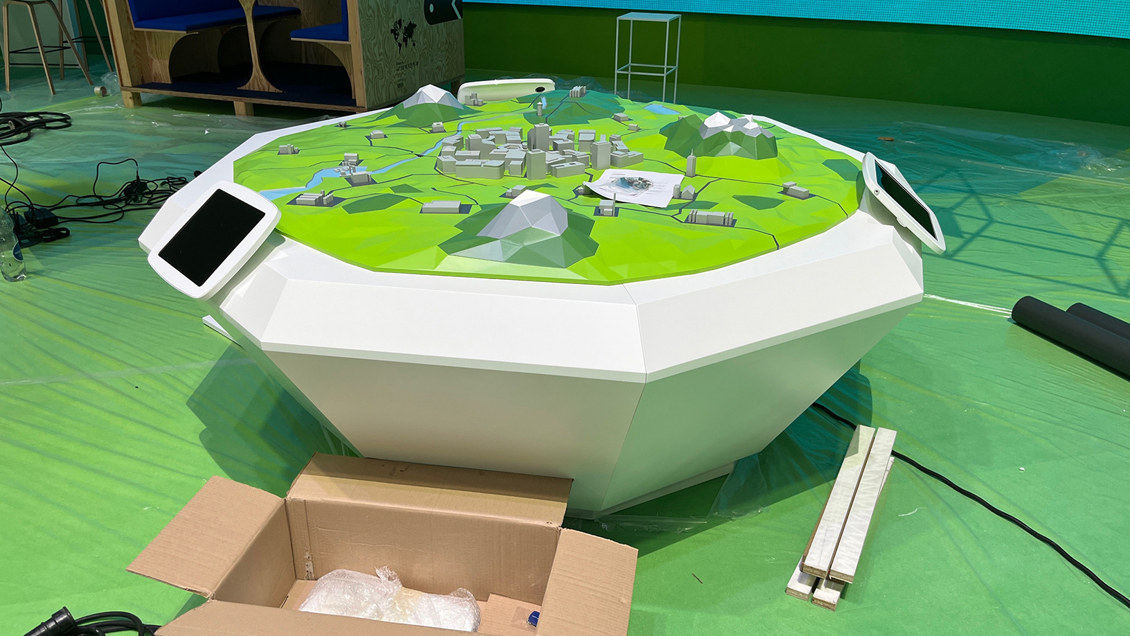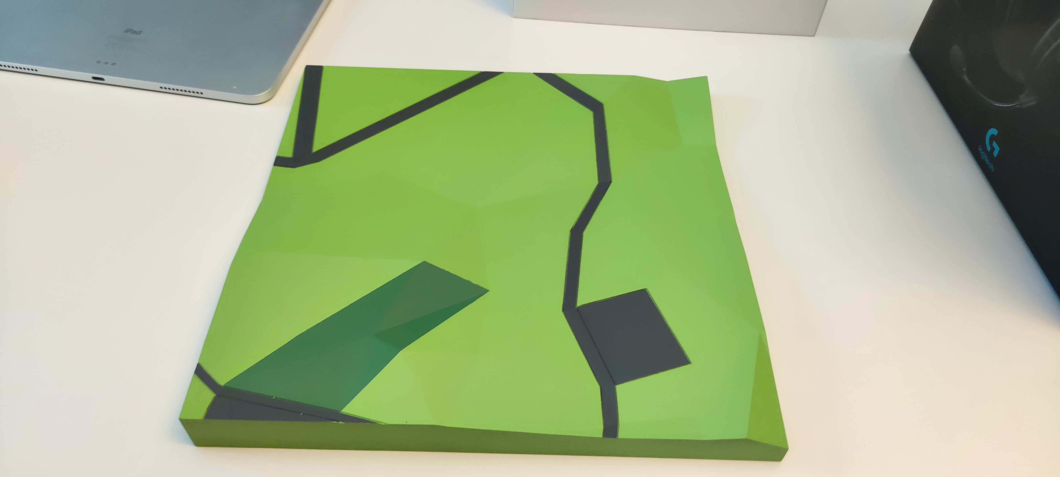 Hey guys and gals, we're developing an AR App (Unity 3D, AR Kit) for a business trade show. We have a 2x2m low poly world physically build on a table, surrounded by three iPad Pro 2021. The table is scanned as an object tracking reference. Now we project the same model in AR on it and display additional information.