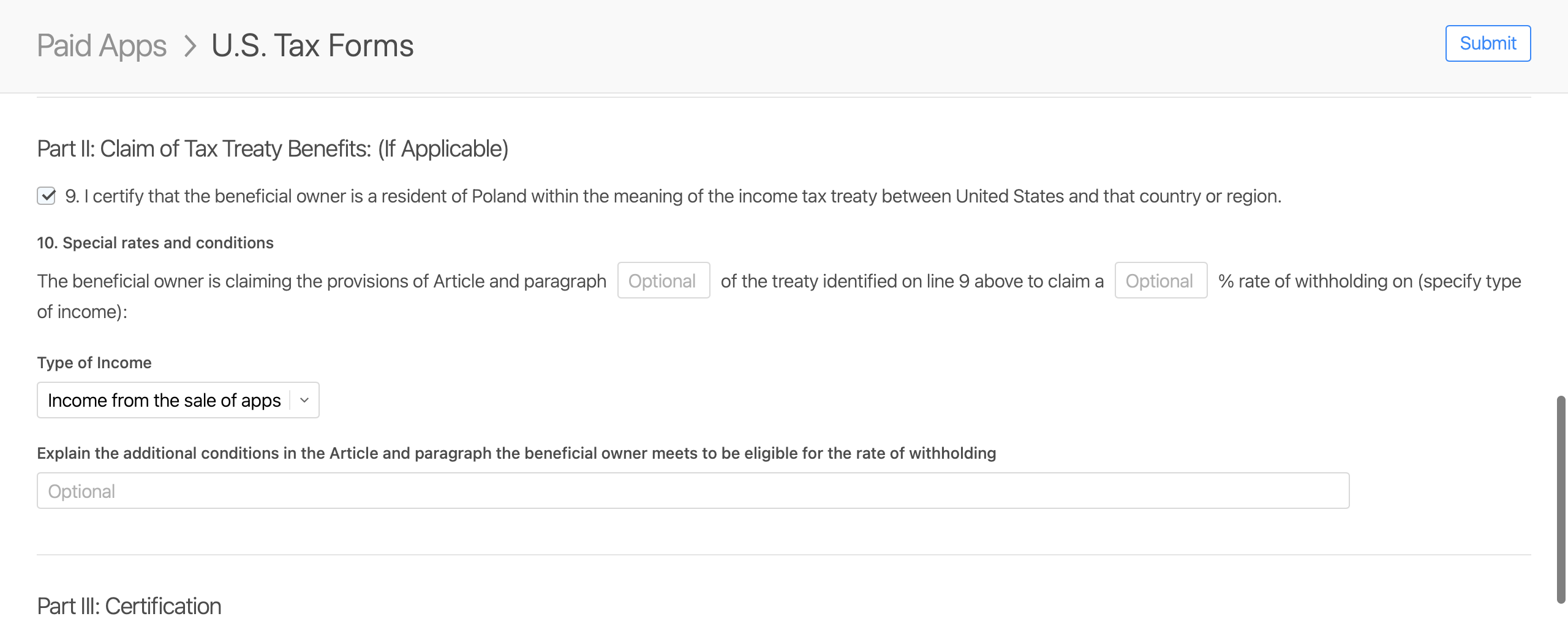 Hello, I am doing tax setup on my App Store Connect account. I am from Poland and will upload Apps as an individual / sole proprietor. I need your help with filling the form W-8BEN. First off, from what I understand, by submitting this form, I can take advantage of the benefits of the double taxation avoidance agreement between Poland and the US, correct? So after I fill it, I will be charged (on the income from the sale of Apps) 0% tax in US and will only pay tax once - in Poland, correct? In Part I, line 6.a. Foreign Tax Identifying Number is optional, but I believe it will do no harm to fill it, correct? In part II, lines 9. and 10. - I need your help. How should I fill these? Or maybe I should not fill part II at all? Please help me. Best regards,