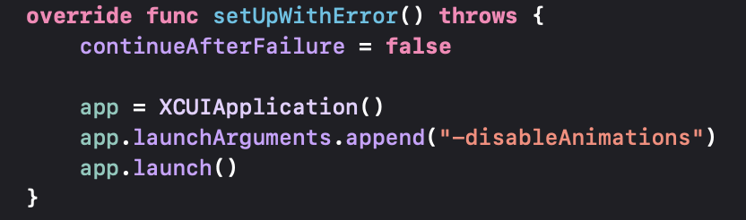 The error always occurs in the setUpWithError func on line app.launch().