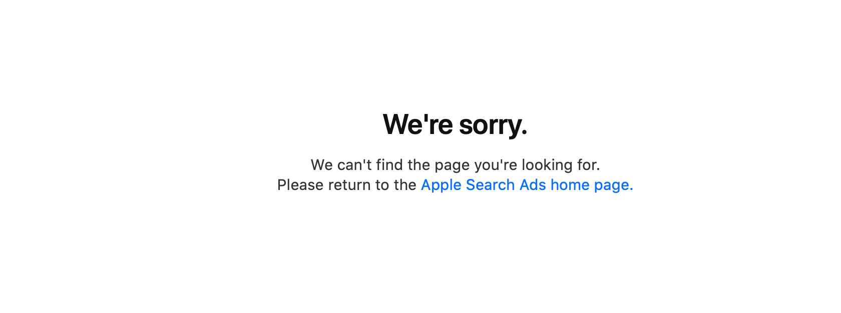 We can't find the page you're looking for. Please return to the Apple Search Ads home page."