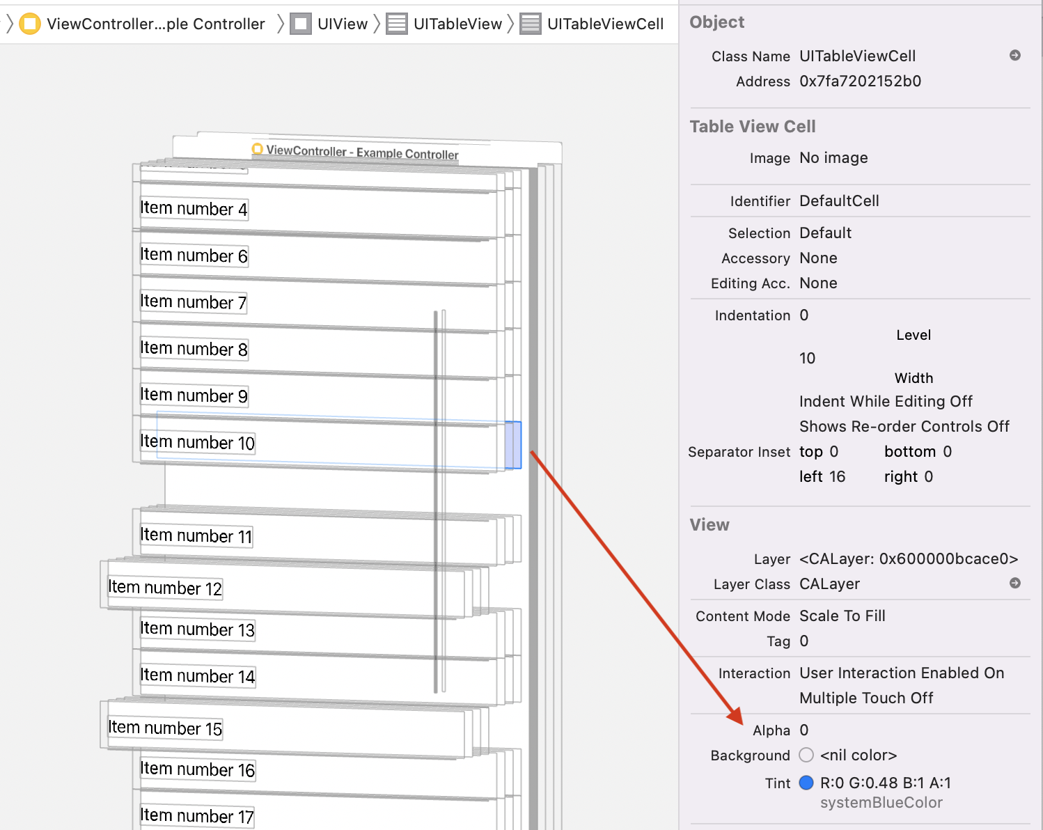 This isn't the only time I've seen a cell disappearing with these drag & drop protocols, but it's the easiest to reproduce. When this bug does occur, you can use Xcode’s Debug View Hierarchy tool to inspect the cell that disappeared. Each time this happens, the cell is still within the view hierarchy, but its alpha has been set to 0.