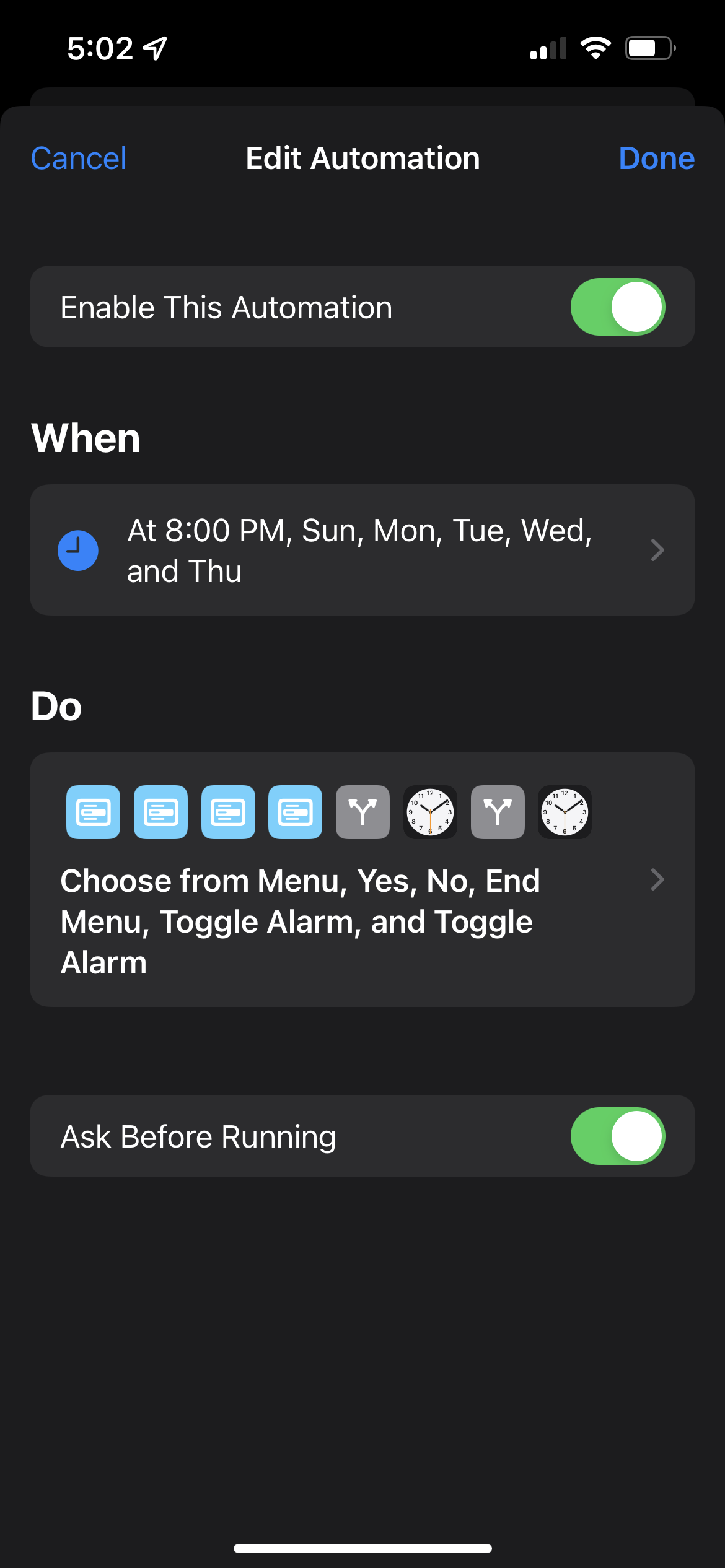 I am creating a shortcut to ask me at a specific time on certain days, am I working from home tomorrow. If I answer with yes, turn on my 8AM alarm, otherwise, if no, turn on my 7AM alarm. I am almost there with choosing a list and if then function but cannot seem to figure out why the rest will not work.