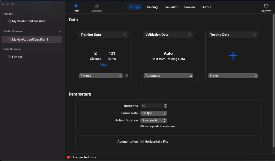 I'm facing an "Unexpected error" in CreatML while training **Action Classification **. I've added more than 100 videos and followed the same steps as per the apple doc but still, an error occurred and there is not much description for an error as well. I've tried different things but nothing worked.