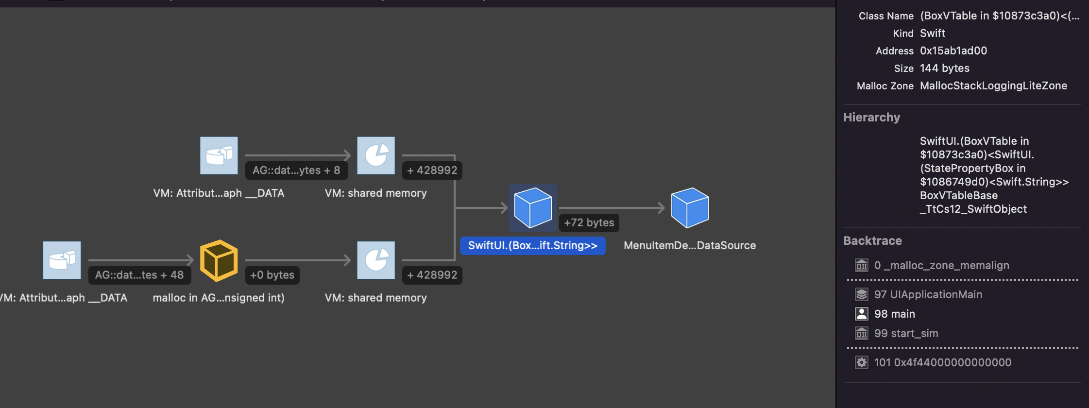 I see the following in the memory graph debugger. It indicates a BoxVTable relation to the observable datastore, which i presume is an internal type i dont have access to, when the view has disappeared