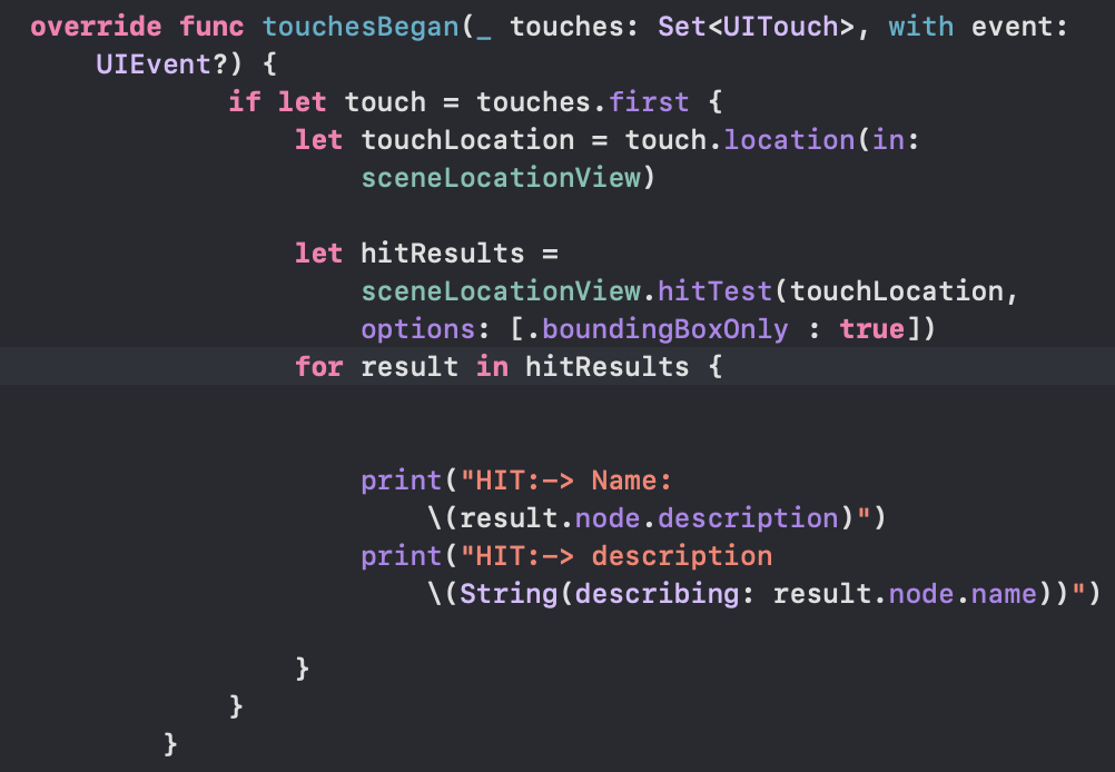 (CODE TEXT/DESCRIPTION) override func touchesBegan(_ touches: Set, with event: UIEvent?) { if let touch = touches.first { let touchLocation = touch.location(in: sceneLocationView) let hitResults = sceneLocationView.hitTest(touchLocation) for result in hitResults { print("HIT:-> Name: (result.node.description)") print("HIT:-> description (String(describing: result.node.name))") } } }