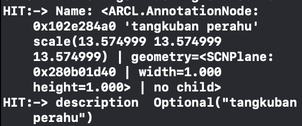 (CODE LOCATION) var location = CLLocation(coordinate: CLLocationCoordinate2D(latitude: -6.7596, longitude: 107.6098), altitude: 2084) let image = UIImage(named: "pin")! var annotationNode = LocationAnnotationNode(location: location, image: image) annotationNode.annotationNode.name = "tangkuban perahu" sceneLocationView.addLocationNodeWithConfirmedLocation(locationNode: annotationNode)