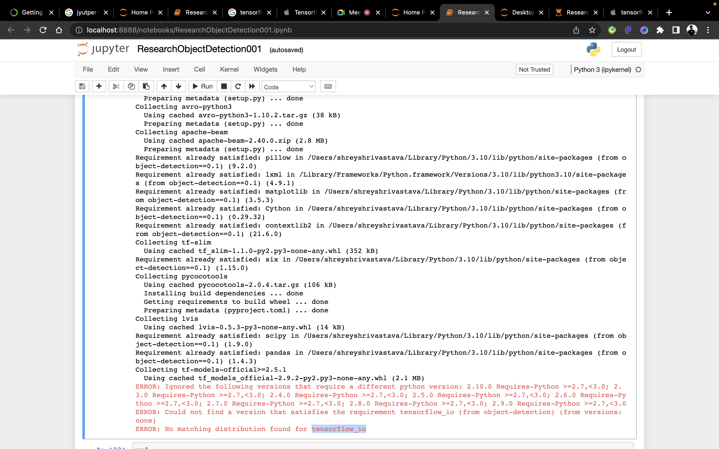 ERROR: Ignored the following versions that require a different python version: 2.10.0 Requires-Python >=2.7,<3.0; 2.3.0 Requires-Python >=2.7,<3.0; 2.4.0 Requires-Python >=2.7,<3.0; 2.5.0 Requires-Python >=2.7,<3.0; 2.6.0 Requires-Python >=2.7,<3.0; 2.7.0 Requires-Python >=2.7,<3.0; 2.8.0 Requires-Python >=2.7,<3.0; 2.9.0 Requires-Python >=2.7,<3.0 ERROR: Could not find a version that satisfies the requirement tensorflow_io (from object-detection) (from versions: none) ERROR: No matching distribution found for tensorflow_io