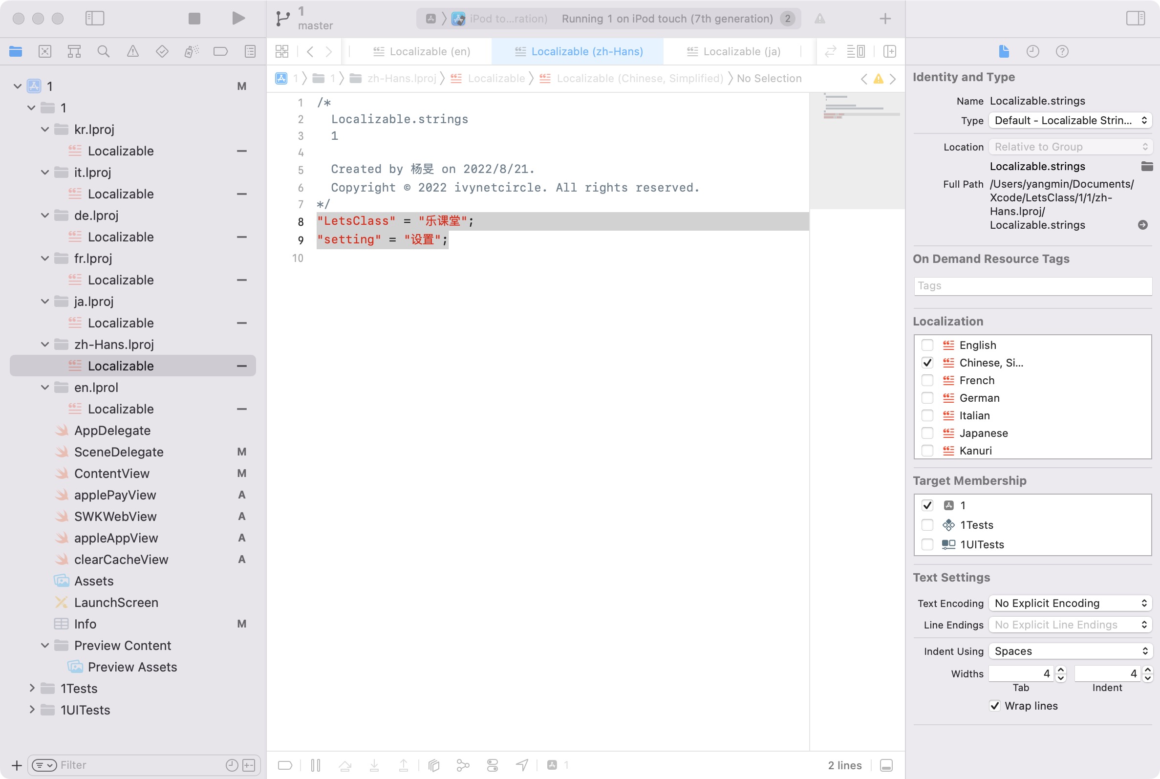 I want to create a multi language app, I created the zh-Hans.lproj and en.lproj folder, and created Localizable.string file under each folder, entered the key and value string on the each string file, and changed the app to the Chinese simplified language, but I am not sure why the it is not working, it does not show the text as Chinese but still in English