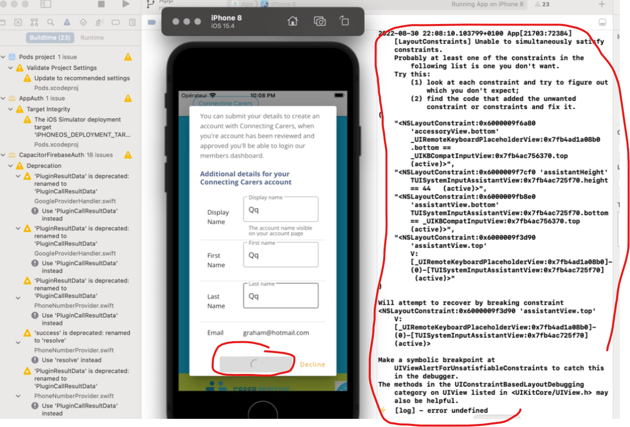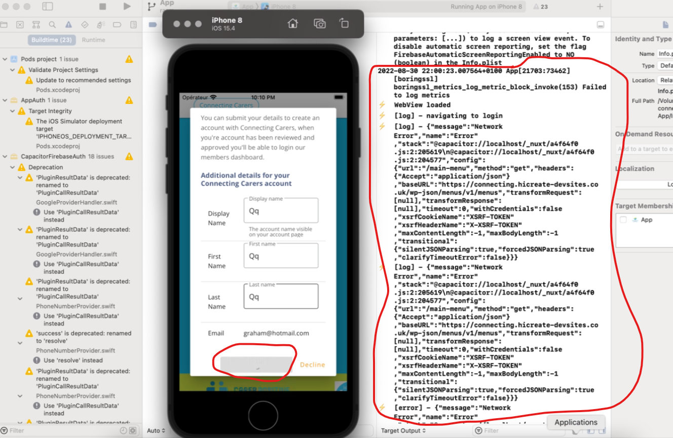 Hi. I have one issue on my ios app. (connecting carers) All login and signup work on android and web app correctly well. And firebase login by email, google and apple work correctly well on ios app. But signup by email, google and apple doesn't work only on ios app First it creates new account from firebase. It works well. After that, when the user add new account in wordpress database, it calls wp api endpoints by https methods(get, post) using axios to create new account in wordpress database. But when we create new account in wp database via wp api by https call on ios app, it doesn't work only on ios app It works on web and android app well.