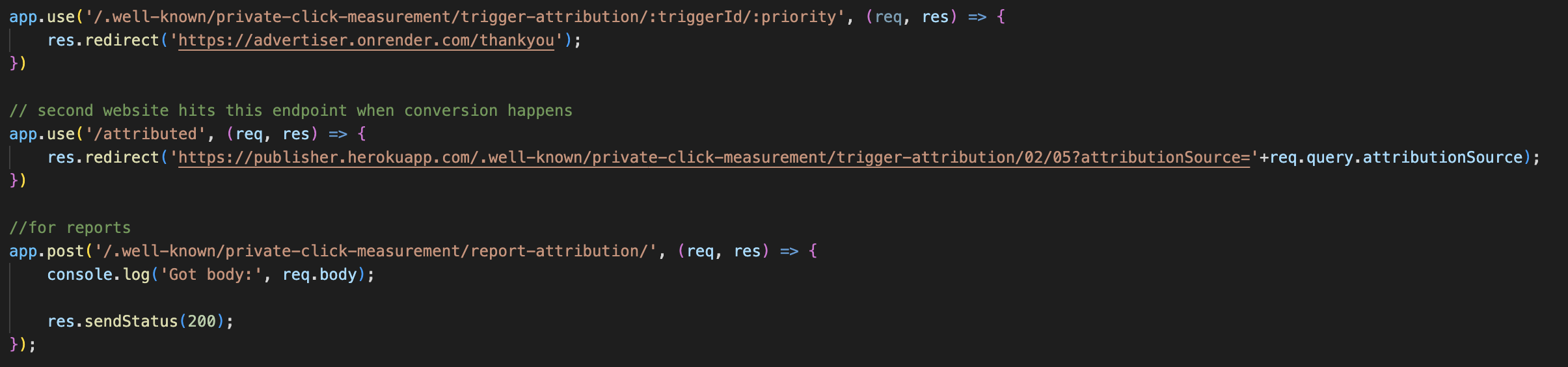 Now the first two steps are happening correctly as can be seen from the screenshot below, but I am not getting the attribution report on the POST endpoint /.well-known/private-click-measurement/trigger-attribution/:triggerId, or for that matter any endpoint as I am logging the requests coming to any of the endpoints on the first website.