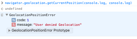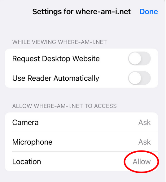 NOTE: This location error is sent IMMEDIATELY without the user being prompted for location access for the website. Device Settings has location access allowed while using and Website Settings are below: