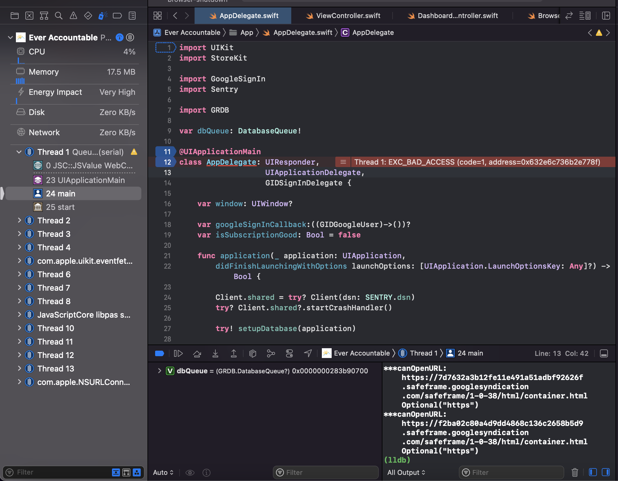 * frame #24: 0x000000010287b458 Ever Accountable`main at AppDelegate.swift:13:7