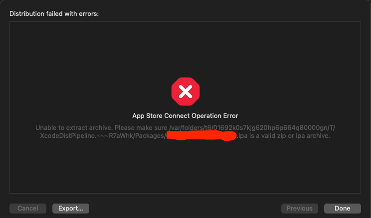 Error: The package could not be unpacked because of the following error: Unable to extract archive. Please make sure /Users/vagrant/deploy/Runner.ipa is a valid zip or ipa archive. Unable to validate your application. (-20008)