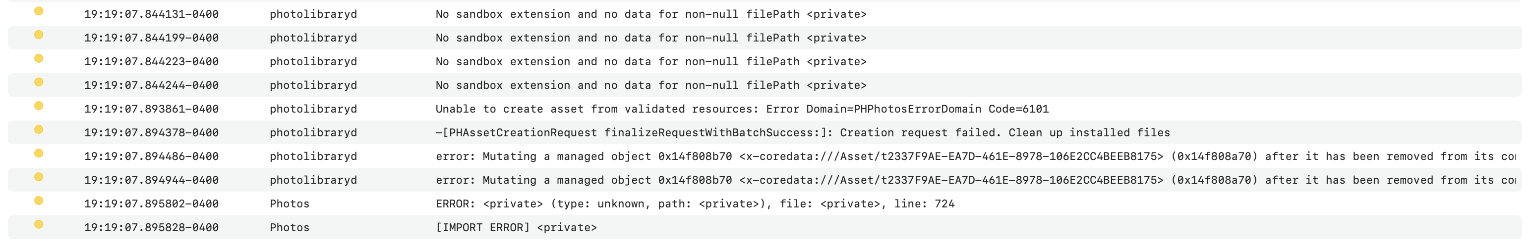 I looked at the console and I get this PHPhotosErrorDomain Code=6101 whenever I try to import photos. I do not have iCloud photos turned on for the Mac or iPhone. I am using a MacBook Pro M1 and have tried importing photos from an iPhone 6, iPhone 8, and iPhone 11 Pro. This error still occurs after trying all these conditions: