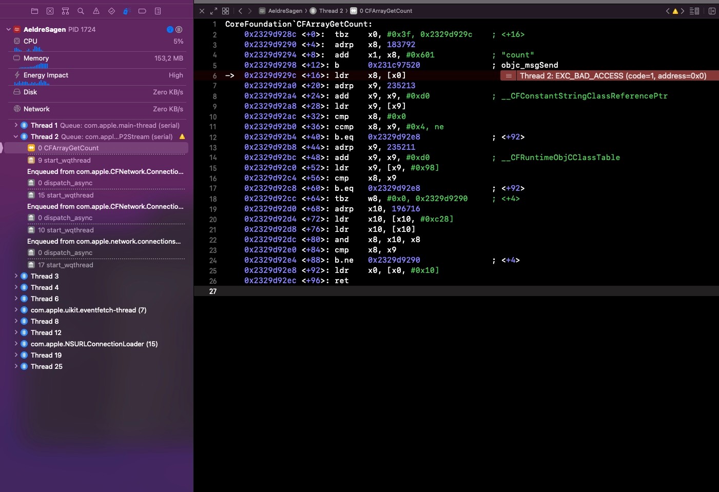 The crash happens after the request has been sent and the response seems to be there. But nothing is, from what is visible through Xcode, received at the time of crashing. So my guess is it's due to some processing of the response, right before we can actually deal with the received data.