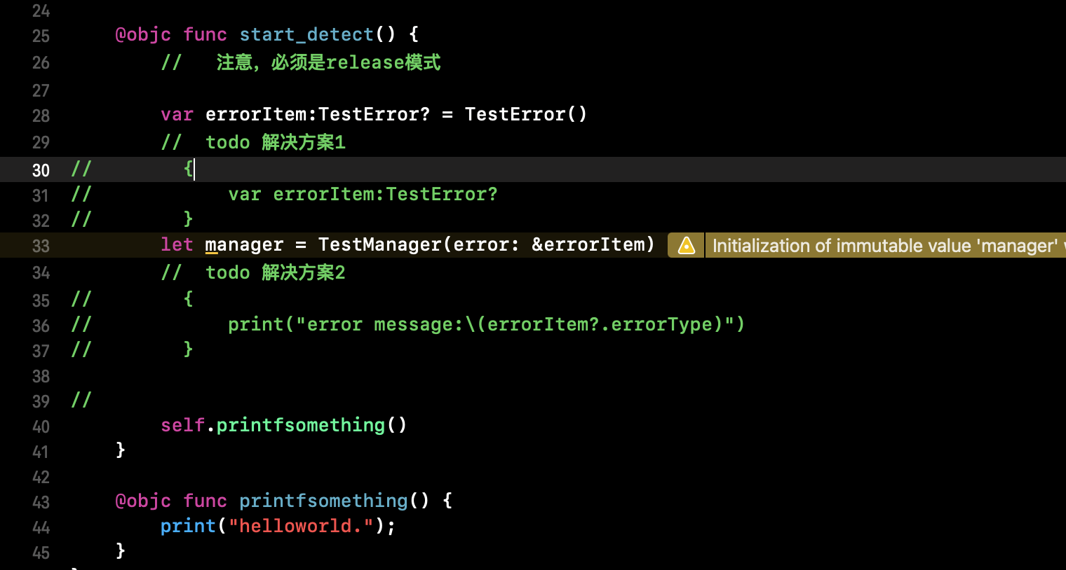 no use: var errorItem:TestError? = TestError() use: var errorItem:TestError?