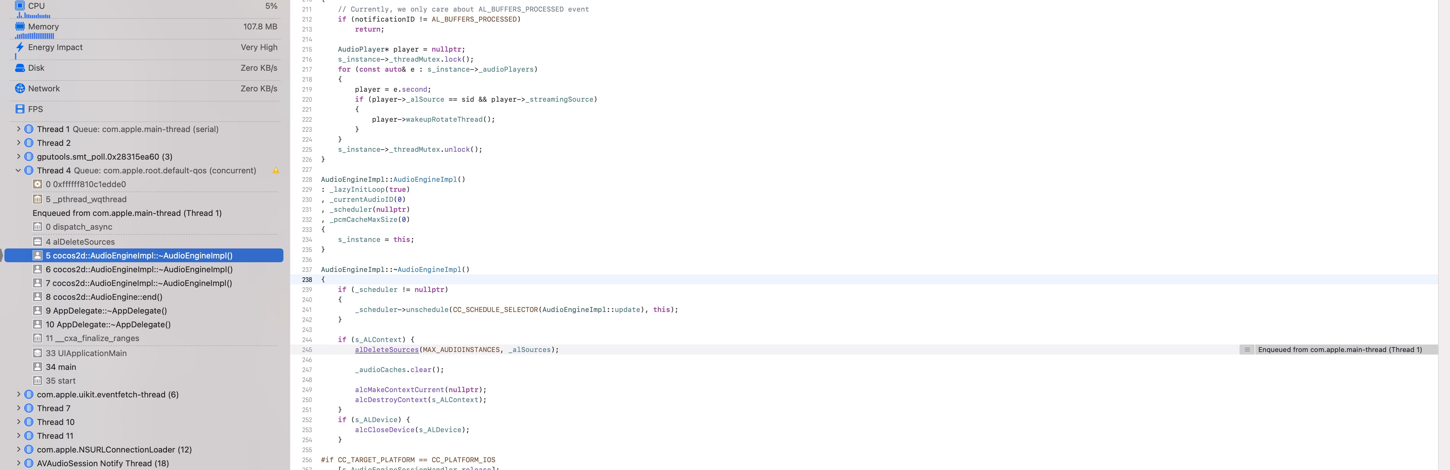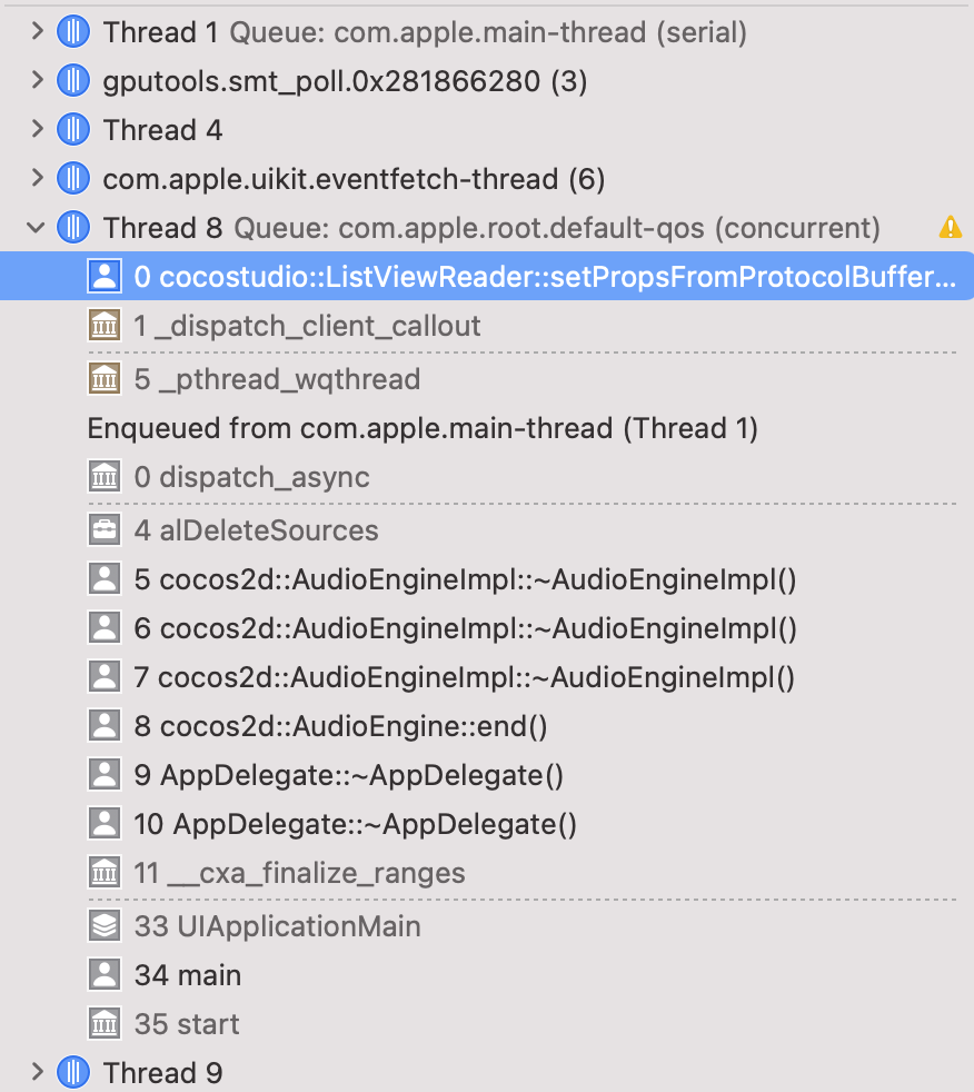 i use cocos2dx 4.0 audioengine play audio, and a high probability of crashing when exiting the app on ios 14.8 devices,You can see it in the picture,each crash may be different at frame 0, but it all starts with alDeleteSources.please help me to solve this,thankyou