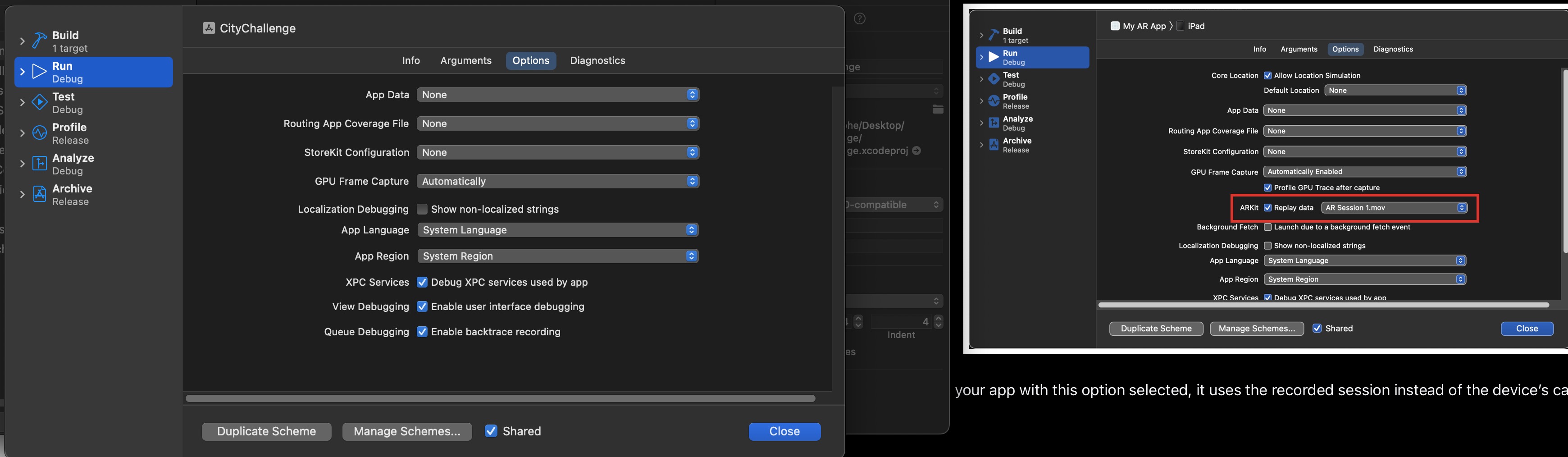 I followed the article "Recording and Replaying ARSession Data" and want to "Use a recorded session in an app". But when I edit scheme as instructed I didn't find the ARKit label.