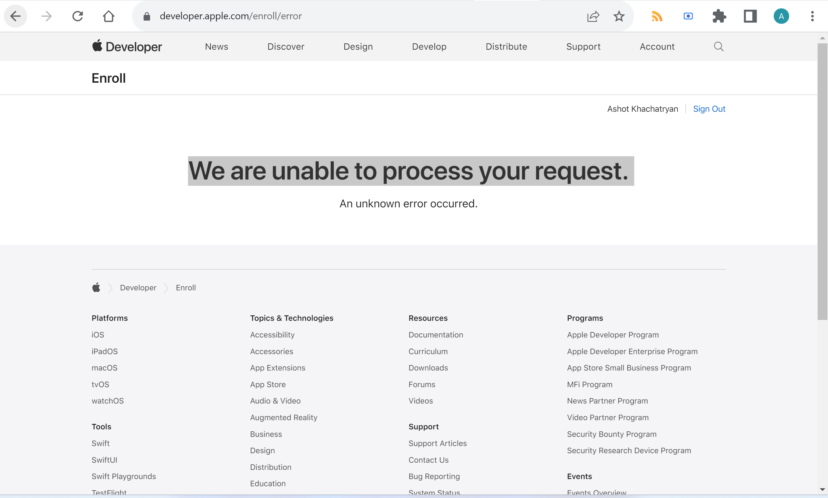 I am trying to register to Apple Developer Program. After filling my mobile phone, address, and bunch of other fields it just brings this page. An unknown error occured. ? If this was some students course work as a programmer that would be somehow acceptable, but for a corporation like Apple this must be a shame.