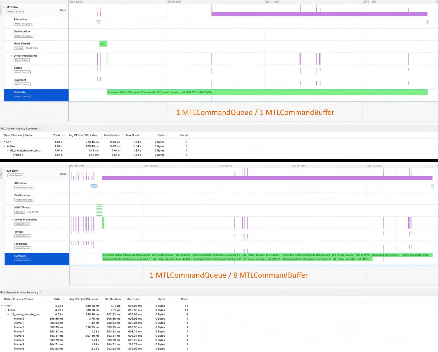 But the performance has not changed and with 1 MTLCommandBuffer in sum is better than when I create 2 or more. Also, as you can see from the figure, it does not matter what kind of parallelism I create, in the profiler it draws only two parallel streams (timeline Compute).