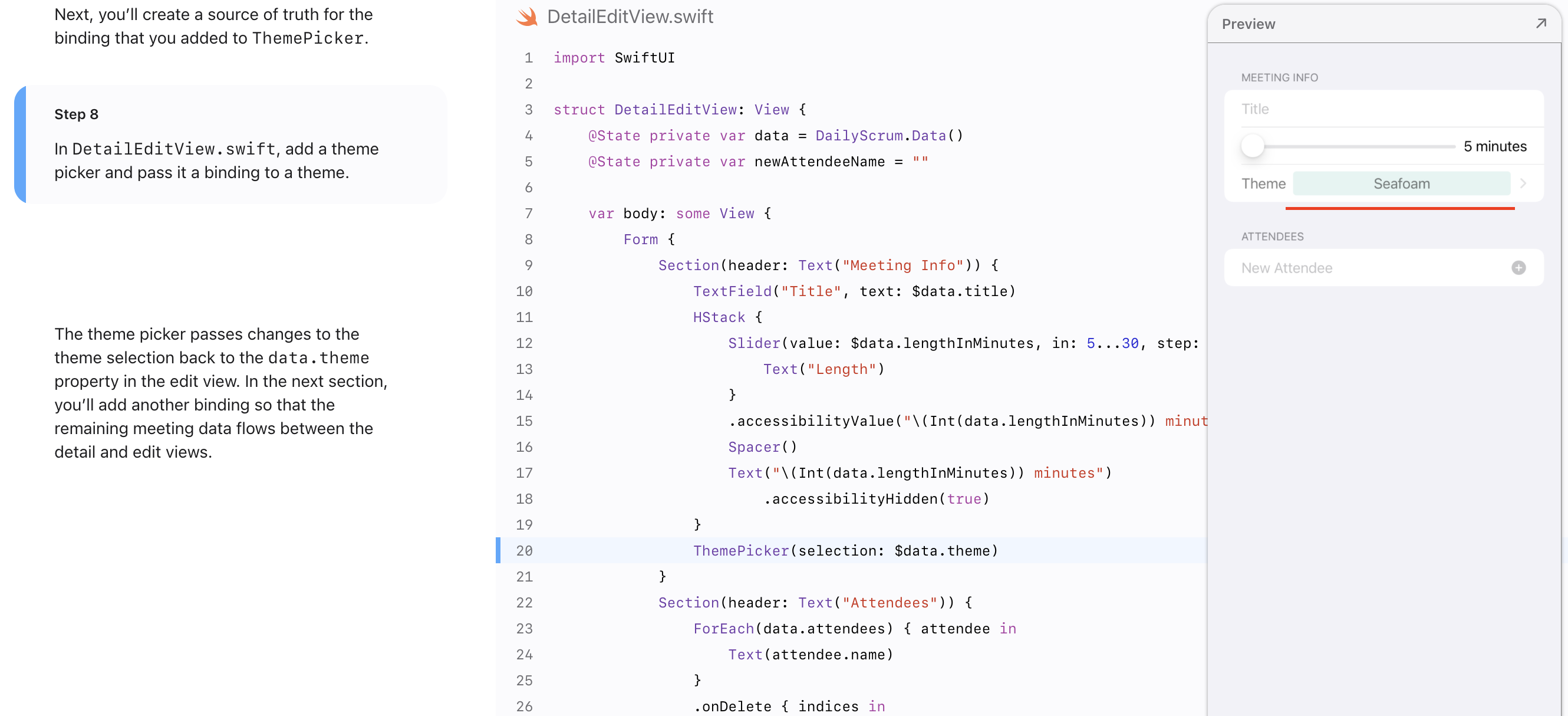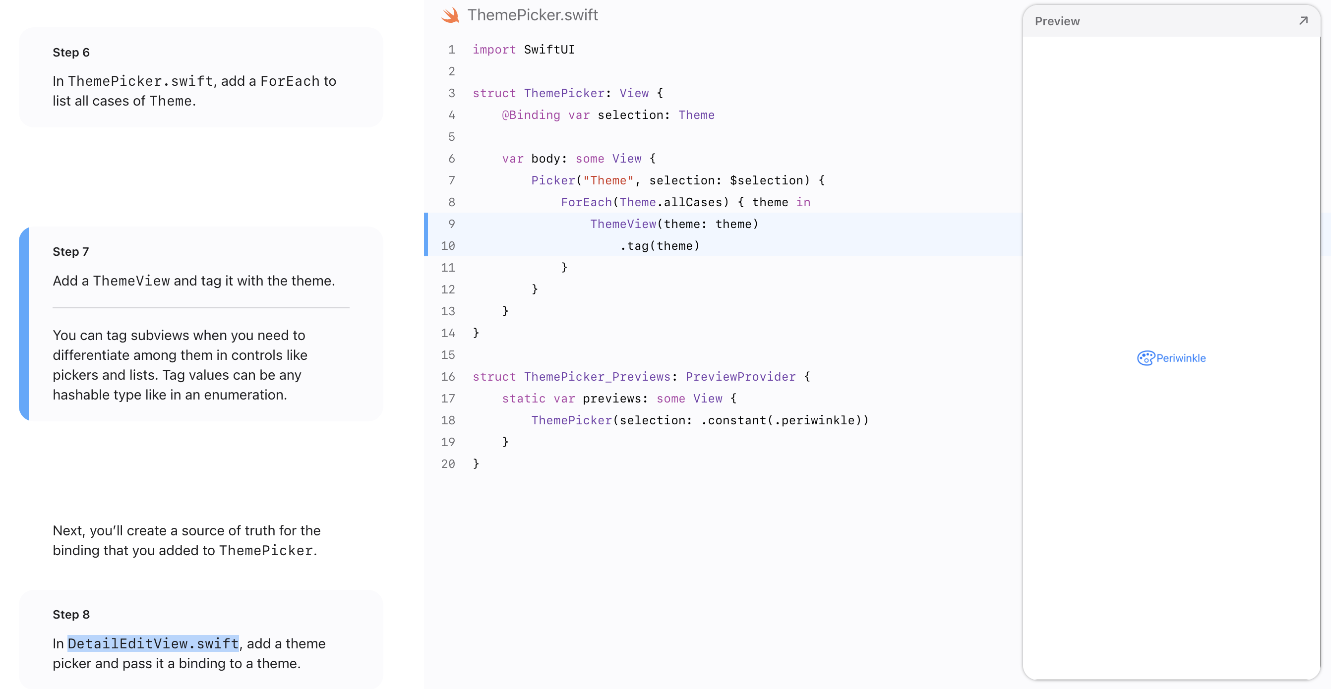 I'm using Xcode 14.1 and was able to follow the tutorial up until this point, where the ThemePicker is introduced in Section 2. However, between Step 7 and 8 I'm getting lost: