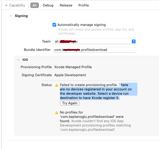 failed to create provisioning profile. There are no devices registered in your account on the developer website. Select a device run destination to have Xcode register it.