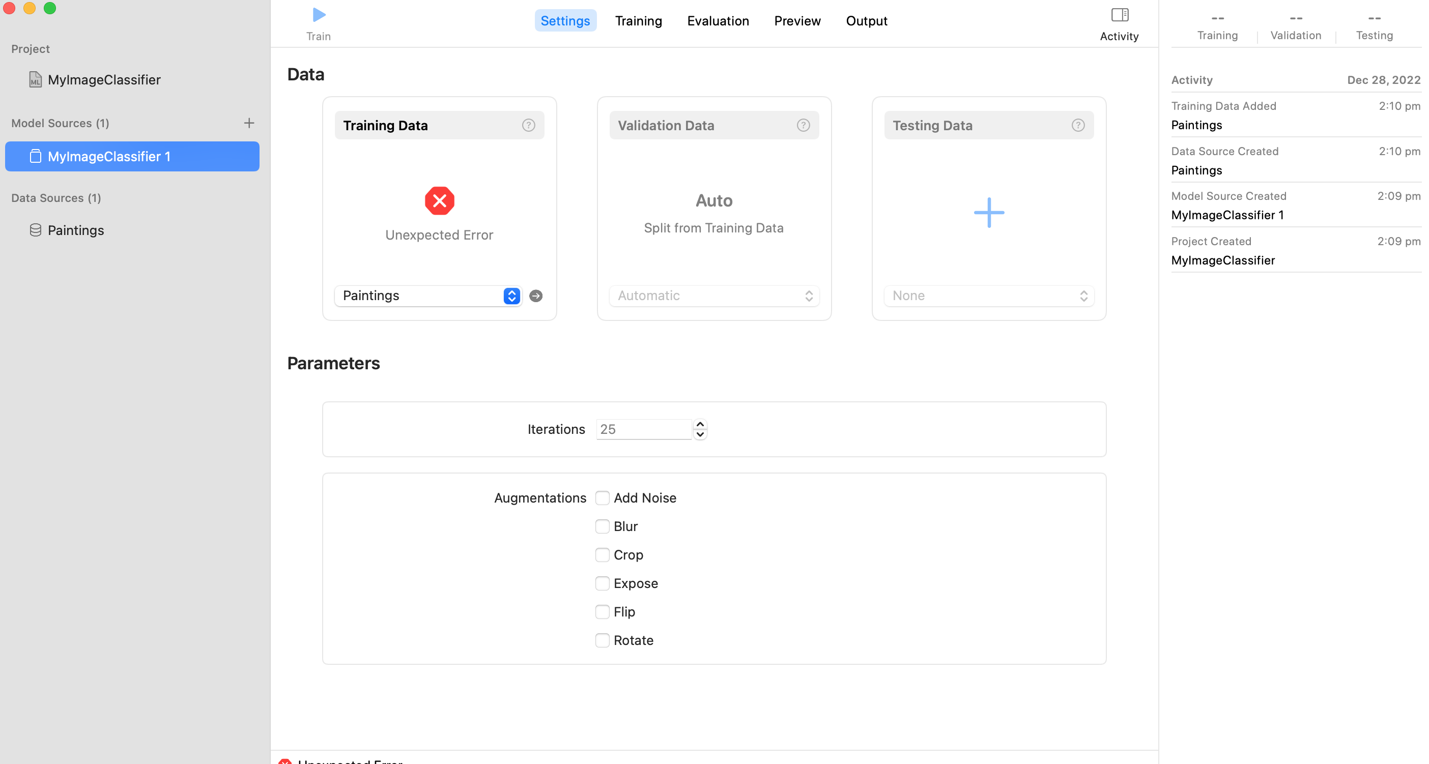 I simply open a new project and choose image classification. I then save the project and then choose the set of image that I want to train. As soon as I drag and drop the image folder in Training data box I get an unexpected error message. I even restarted my macbook and restarted XCode and CreateML.