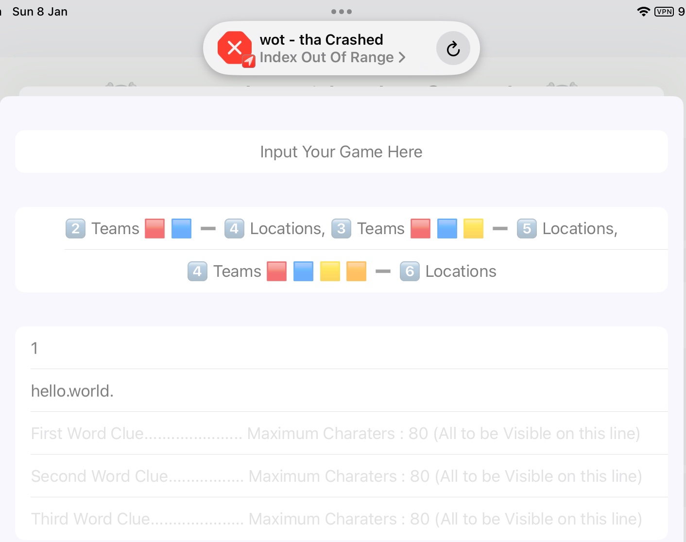Still requires an error trap to prevent an index out of range when eg. hello.world. (no word after the world full-stop, hello..today also produces the same error for example) is mistakenly entered in my firstCardWords field. I have managed to trap spaces, not having the required number of full-stops and a nil entry but nothing after a full-stop produces an error that crashes the app. Also is there a better way to handle this input (preferably not too complicated ) to prevent all instances that will cause index out of range in this example?