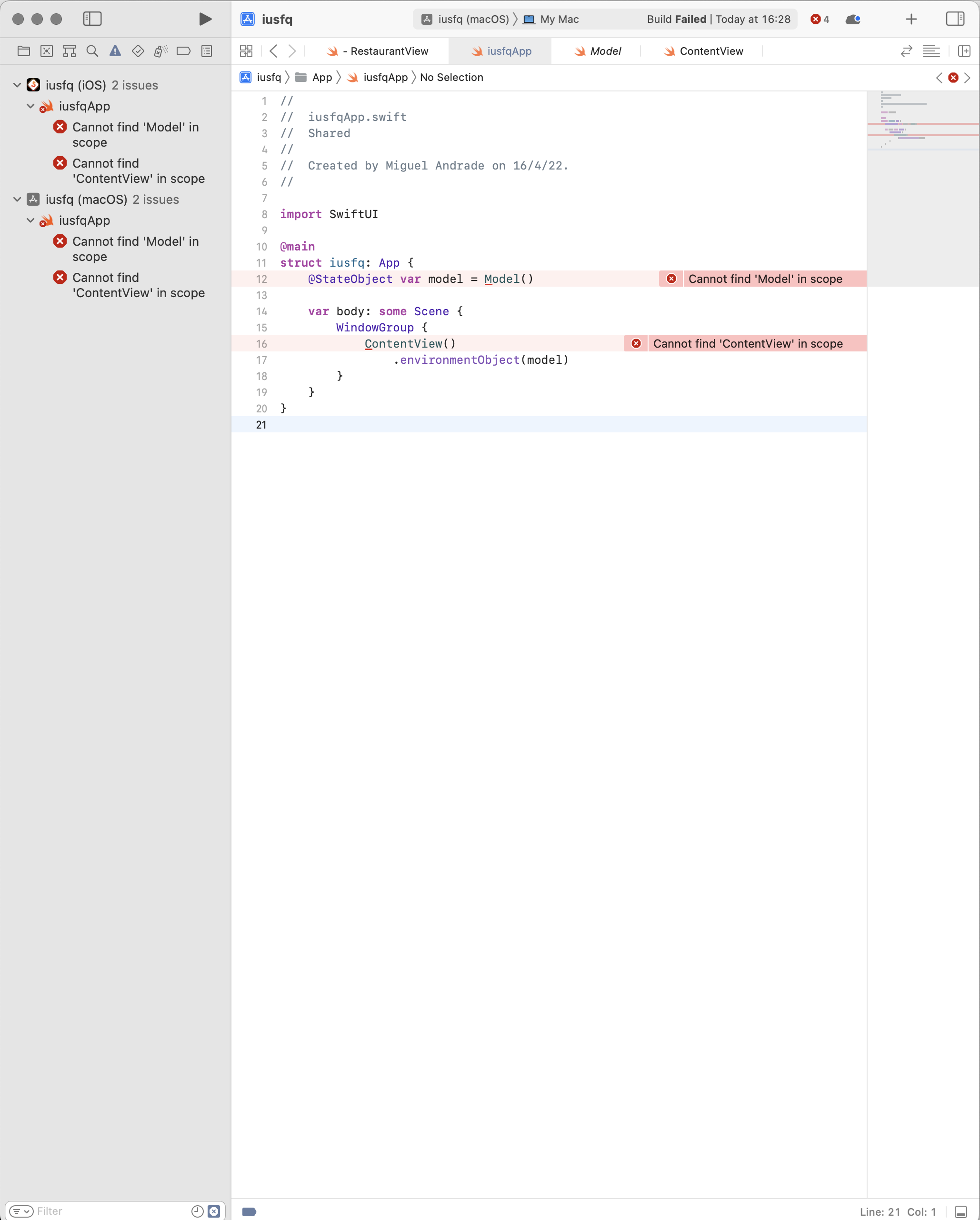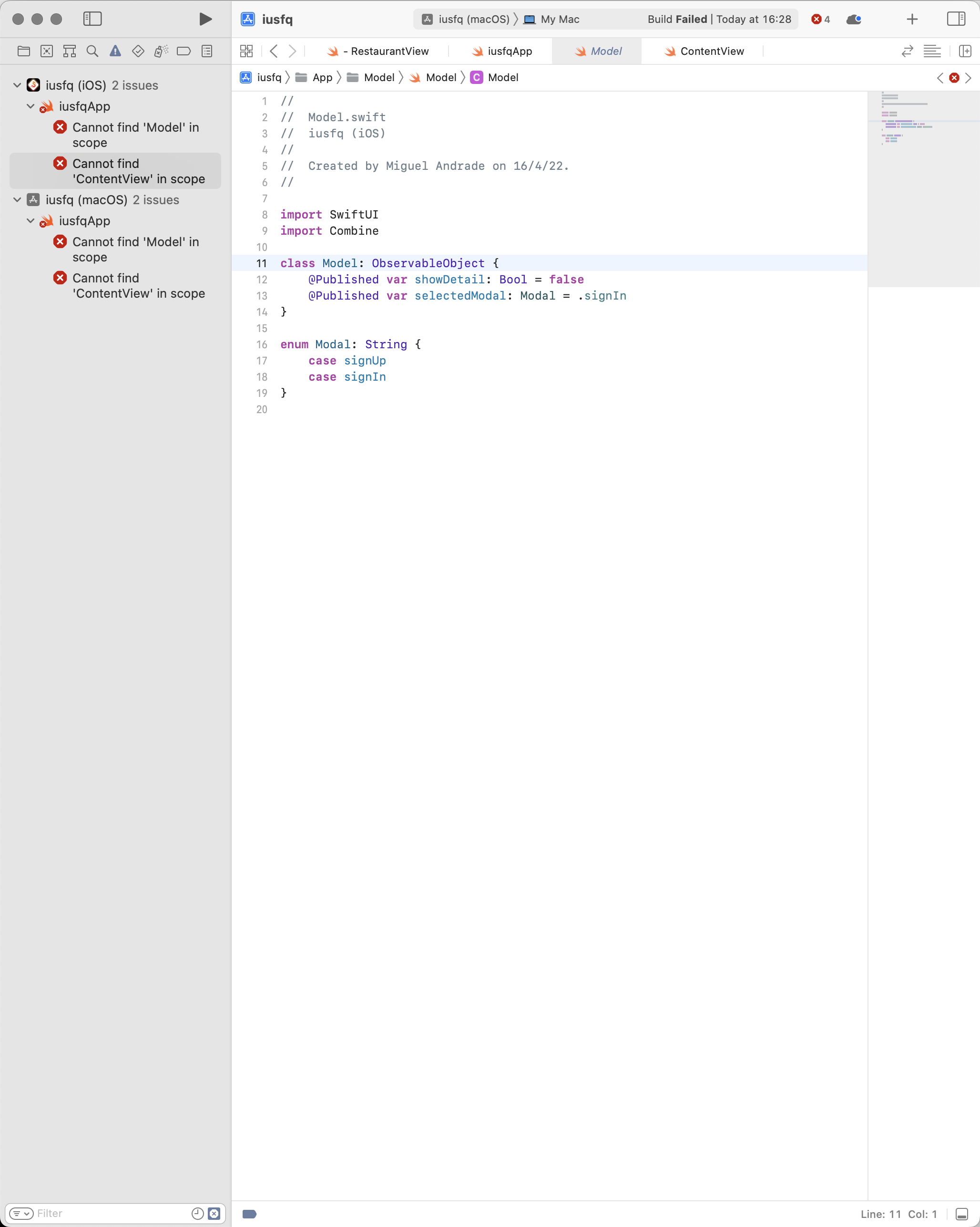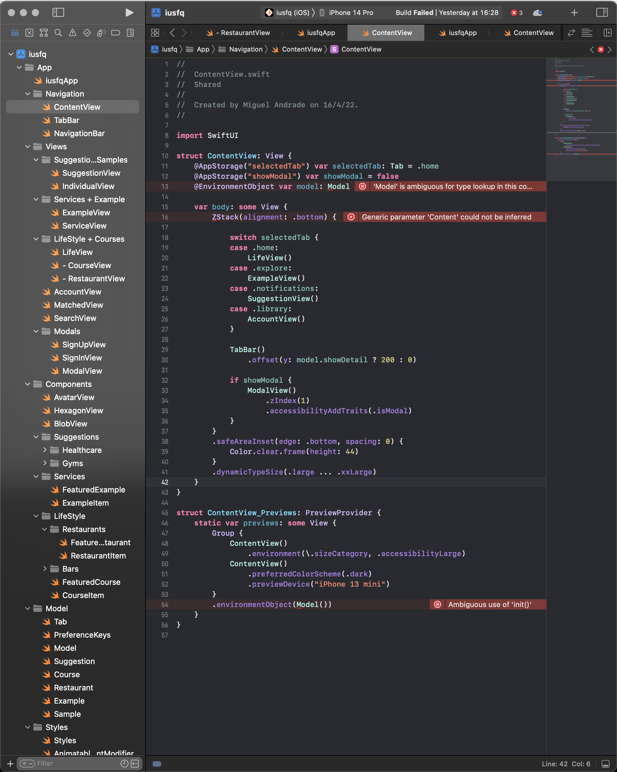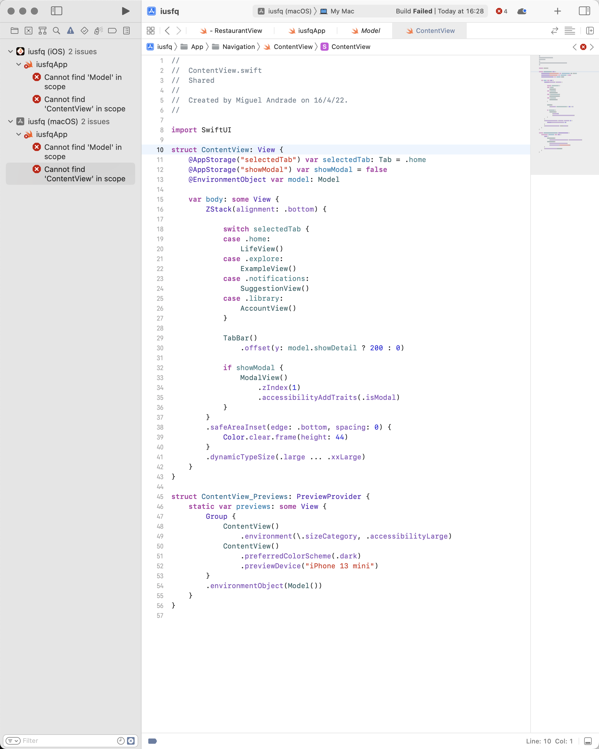 I started dis app attempt last year and decide to retake on it. But since I updated to the last version of Xcode I started to hace this issue that I can't seem to figure it out. I was comparing it with another version of this same project that I had and I still don't understand the error. English ain't my first language, sorry for any misunderstanding.