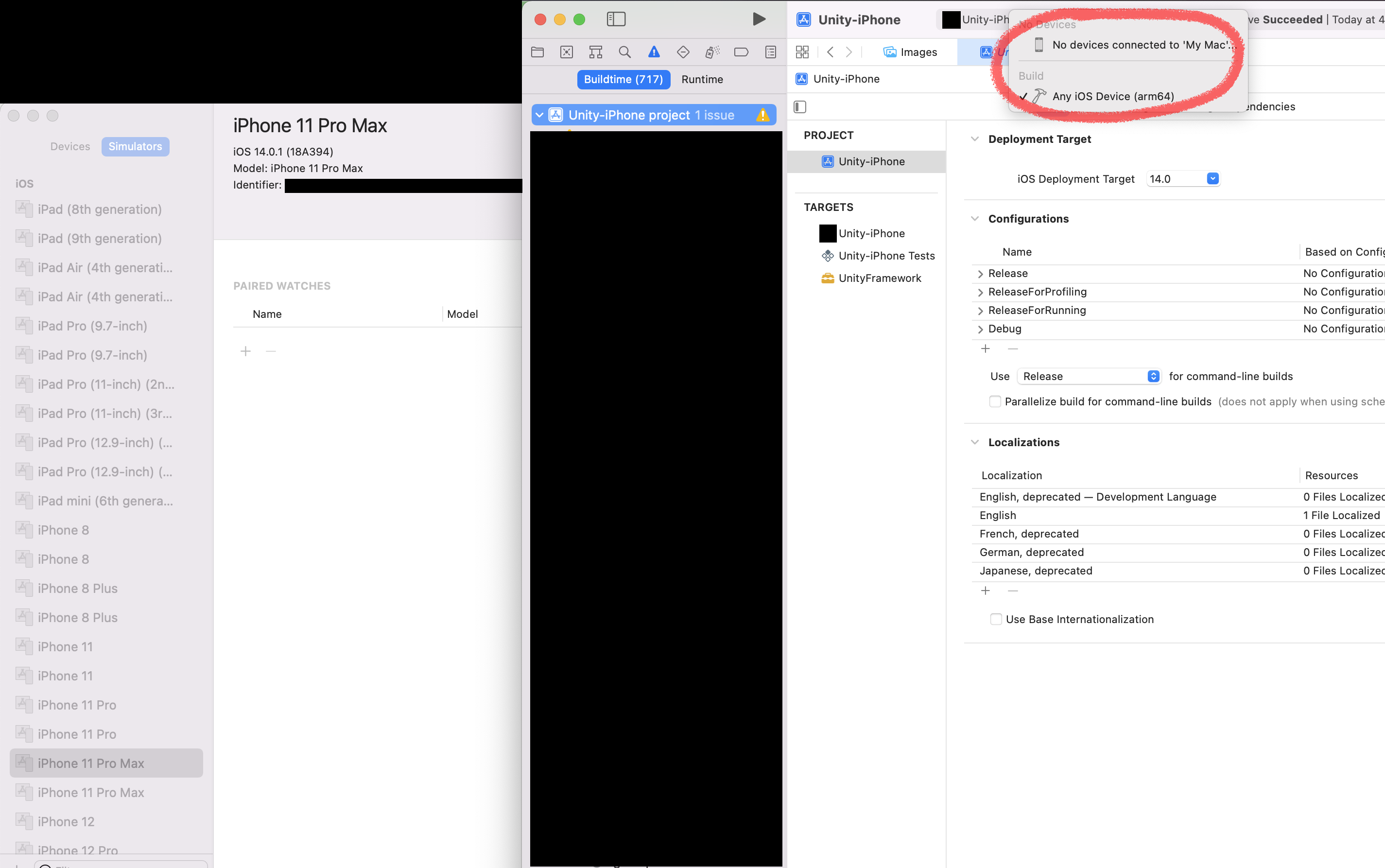 No simulators appear as a play option for my Unity app. In Xcode's scheme menu dropdown it doesn't show any sims (just "No Devices" and "Build: Any iOS device (arm64)"), the play button gives the error "A build only device cannot be used to run this target." and suggests choosing a simulated device but I can't figure out how to choose a simulated device... probably something silly, but I'm beside myself.