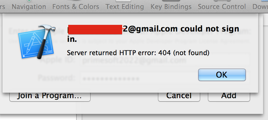 I am having an issue with Xcode 6.2 That can't sign in with my Apple id. I have Get the Error "Server Returned Http error: 404 (Not Found)". Please Help Me