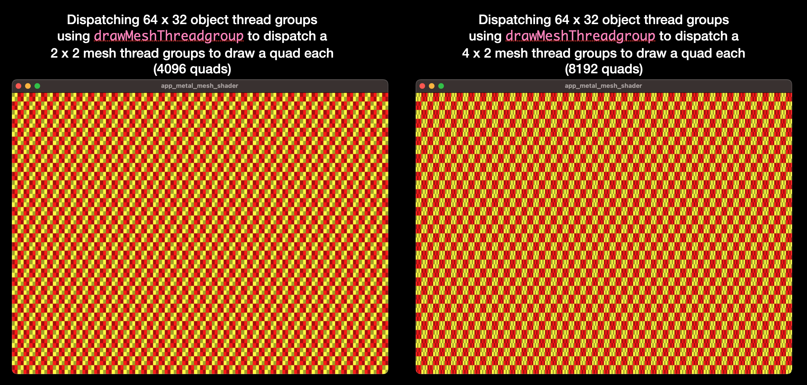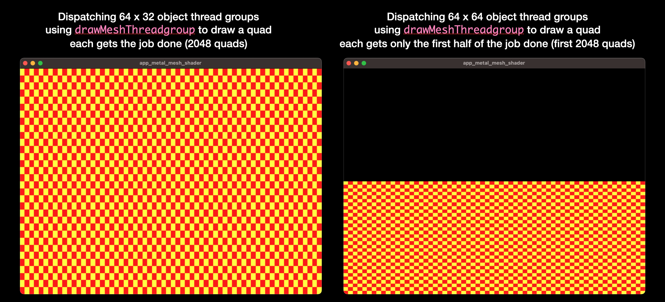 I have set up a simple mesh render pipeline, where I dispatch [N, 1, 1] object threadgroups, where N is the number of instances of a mesh to render. There is only one thread per object threadgroup, and each object threadgroup dispatches a single mesh threadgroup. Each mesh threadgroup passes an entire mesh instance to the rasterizer.