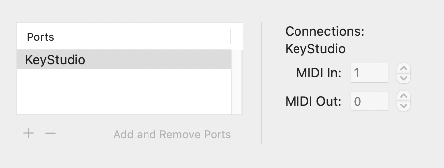 Problem: Audio MIDI setup incorrectly maps the USB MIDI ports of the KeyStudio and shows a device with a MIDI input and no output, not particularly useful for a keyboard (see grab). Because this device is grabbed on USB initialisation, it's not possible to manually add an output port ('add remove ports' and increment is greyed out). Therefore, it's not possible to route the KeyStation MIDI output in the MIDI Studio app. Deleting, rebooting and replugging the device does not clear the problem - it just reinstalls the faulty device mapping.