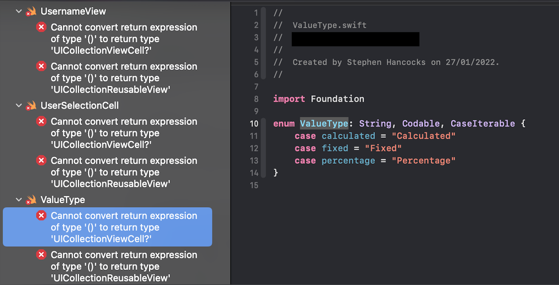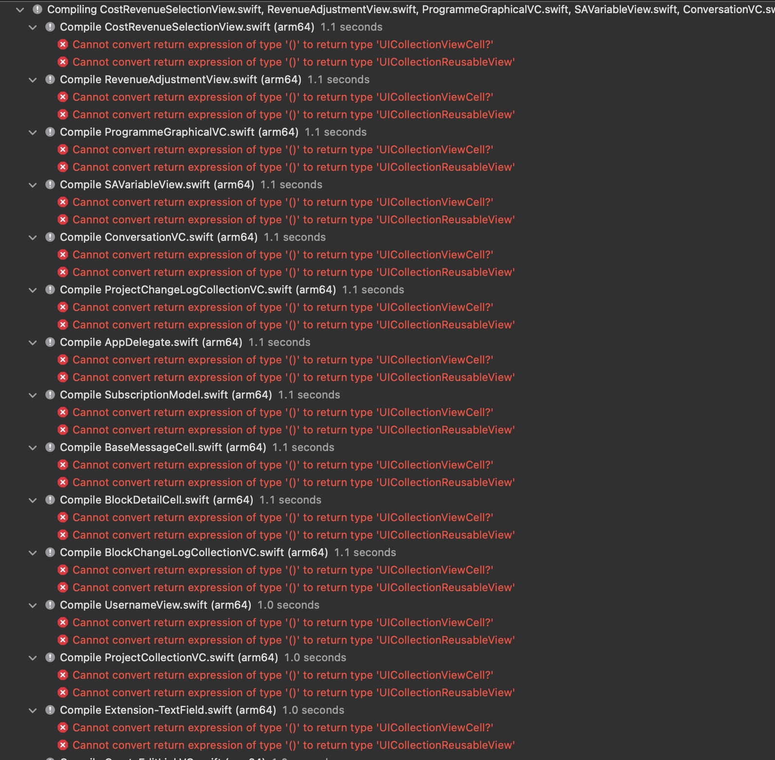 In addition, the errors are always related to collection views, yet Xcode is showing errors for simple extension files or enum files, which have nothing to do with collections.